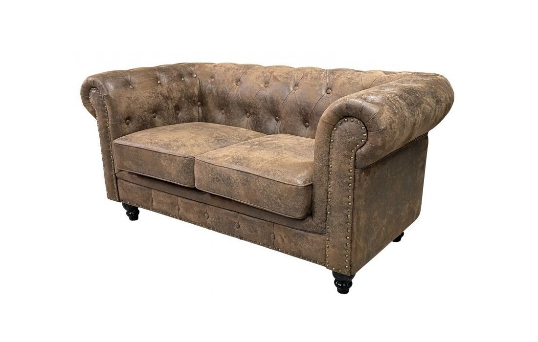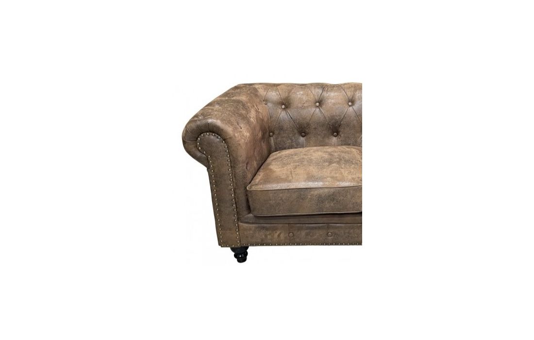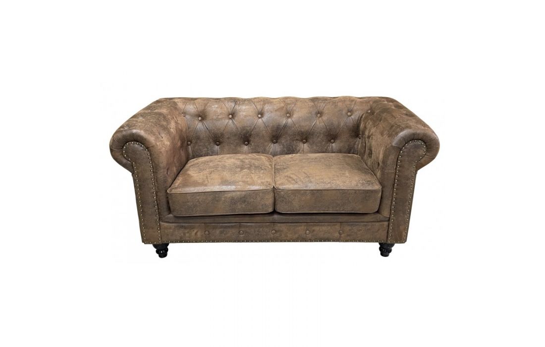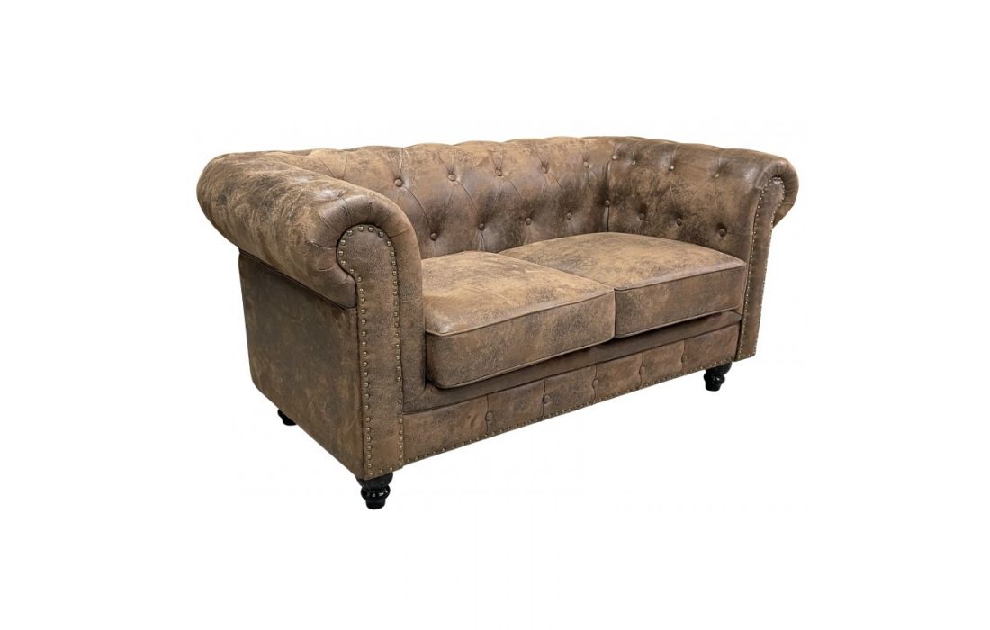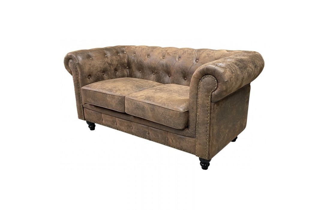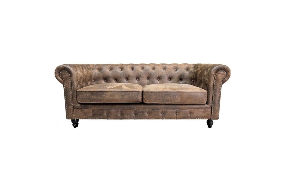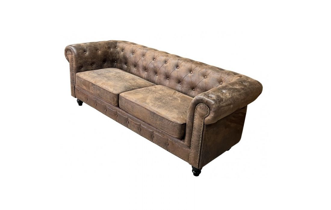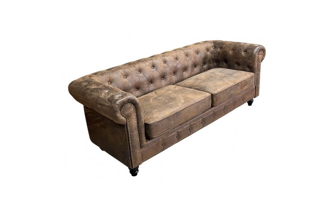 Sofá revestido com pele sintética vintage e estrutura em madeira.