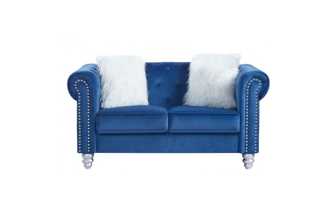 Sofá revestido com tecido aveludado. Almofadas decorativas incluídas.