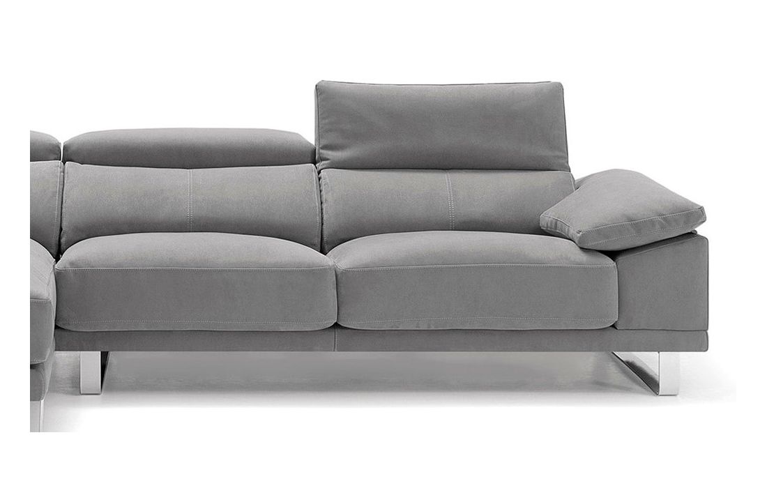 Especificações do Produto Revestimento em tecido, pele sintética e pele genuína Estrutura em madeira e metal Largura do braço 28 cm Largura da Chaiselong 113 cm Interior Espumas de 1ª qualidade Almofadas dos assentos com espuma HR 35 KG com viscoelástica fibra Apoios de cabeça reclinaveiscom altura até 70cm abatid Pés metálicos