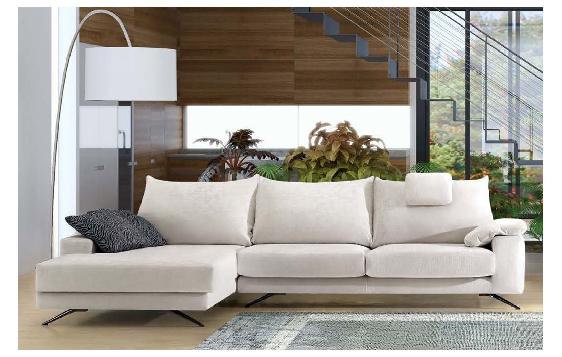 Especificações do Produto Revestimento em Tecido Possibilidade de outros revestimentos mediante solicitação Estrutura em madeira Interior com espumas e precintas de 1ª qualidade Pés metálicos Largura da Chaiselong 115 cm Inclui 3 almofadas decorativas 50x50cm