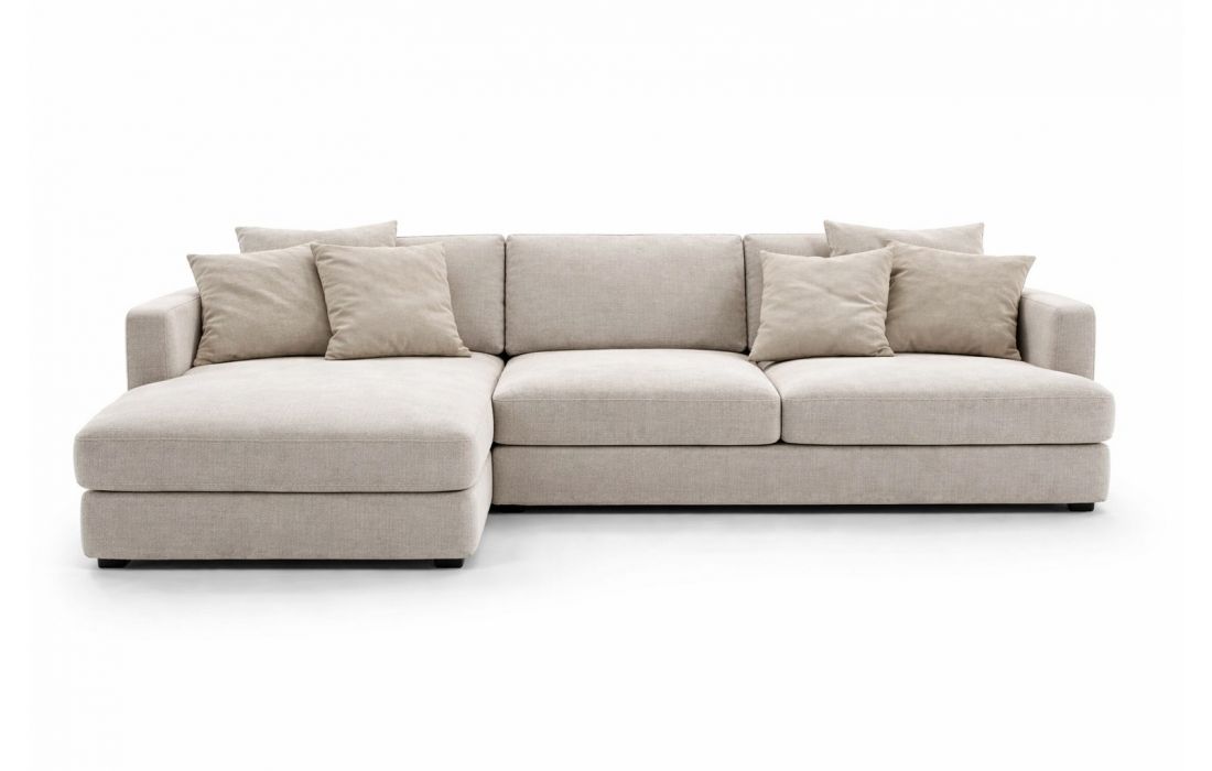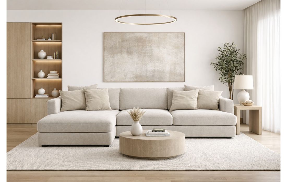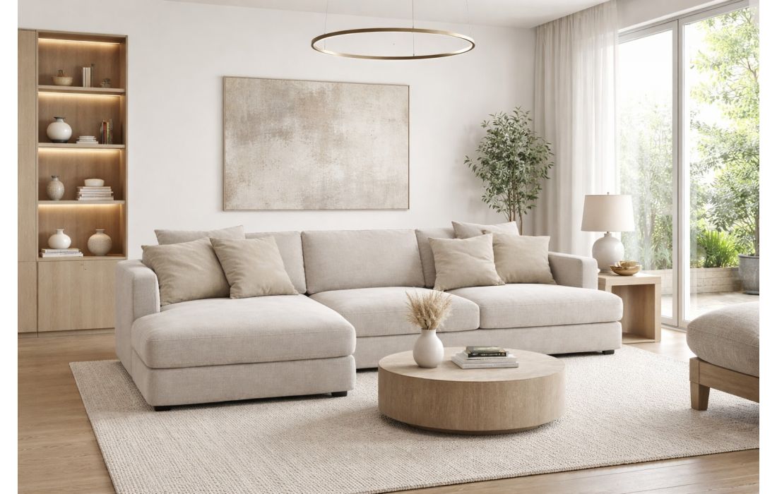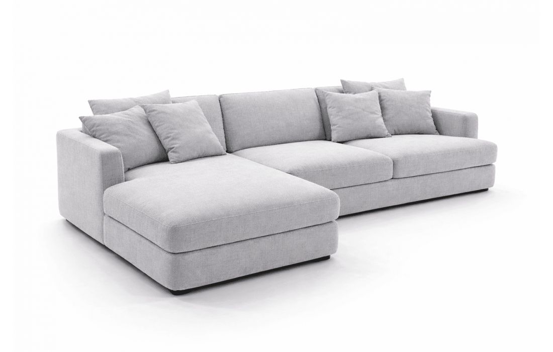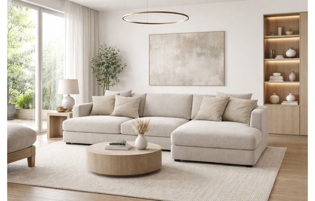 Sofá com chaise longue de design moderno, ideal para ambientes contemporâneos e minimalistas.