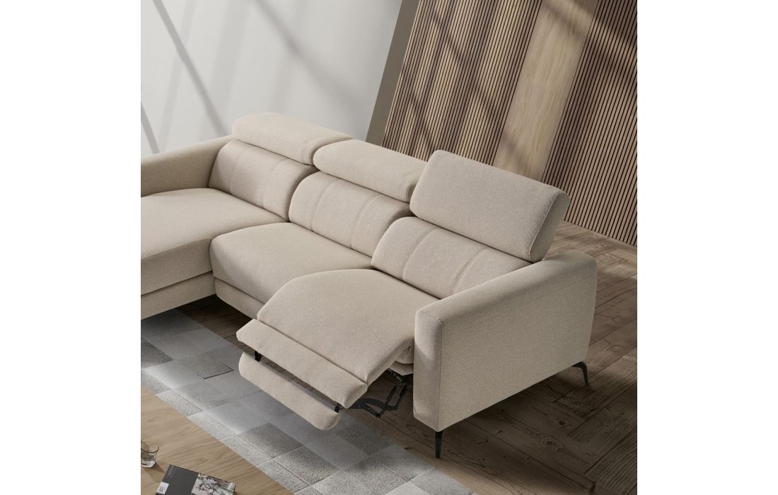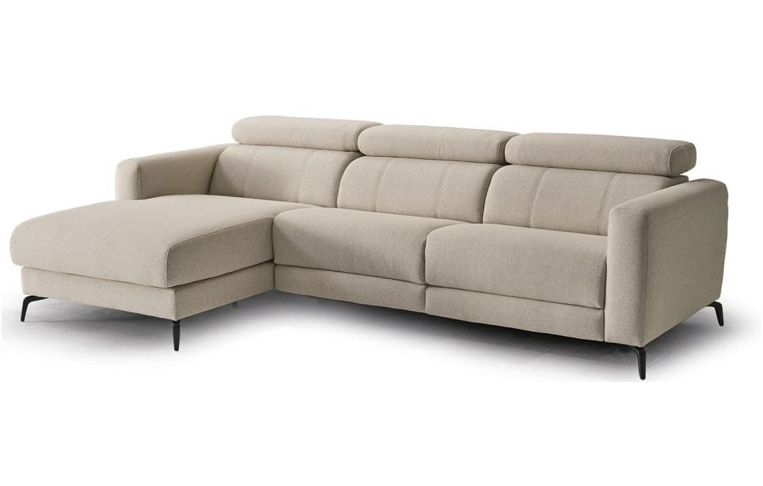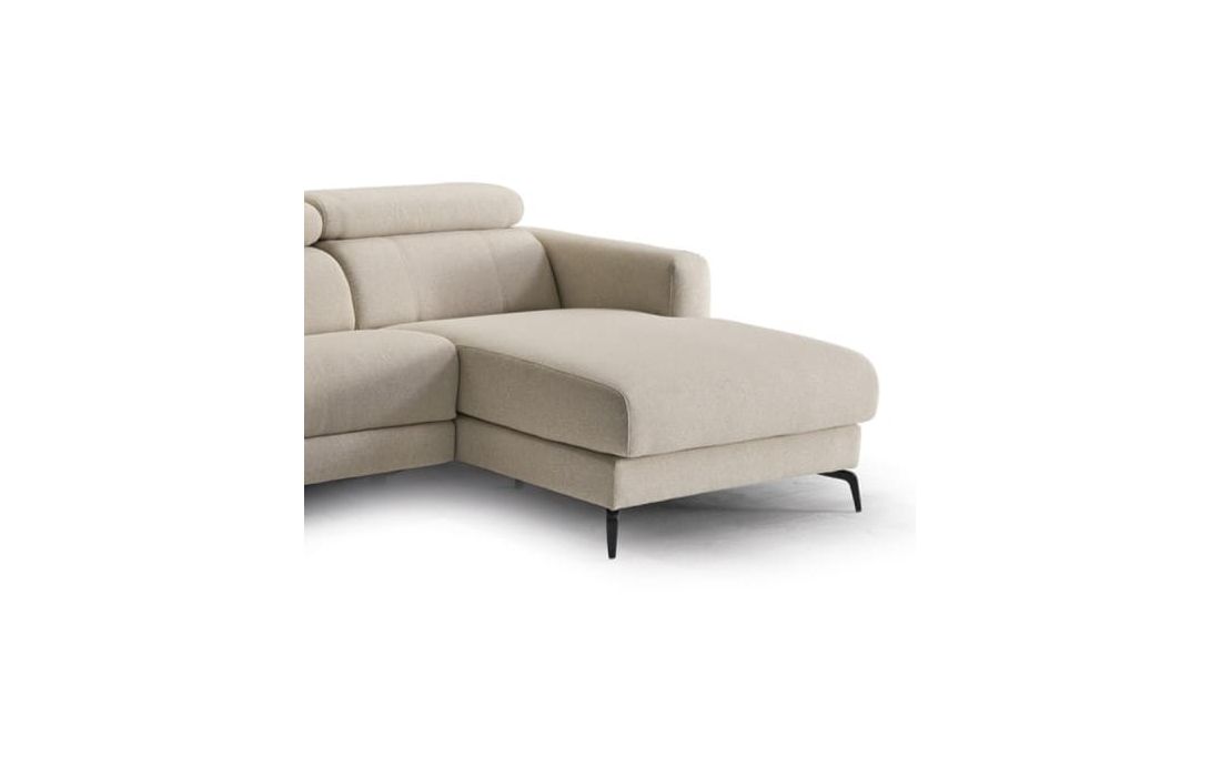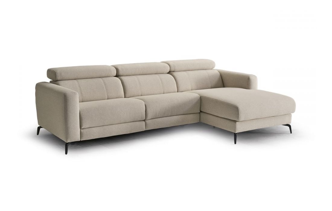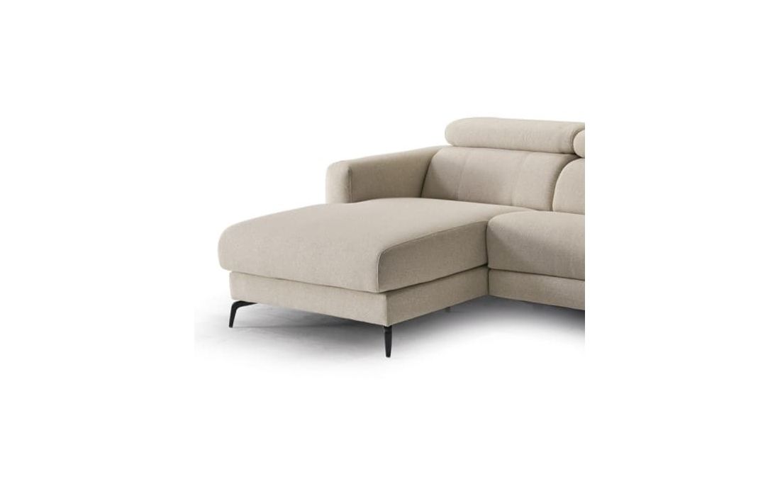 Sofá de 3 lugares com chaiselongue, estrutura em madeira forrada a tecido com pés de metal preto e 2 relaxs incluídos.