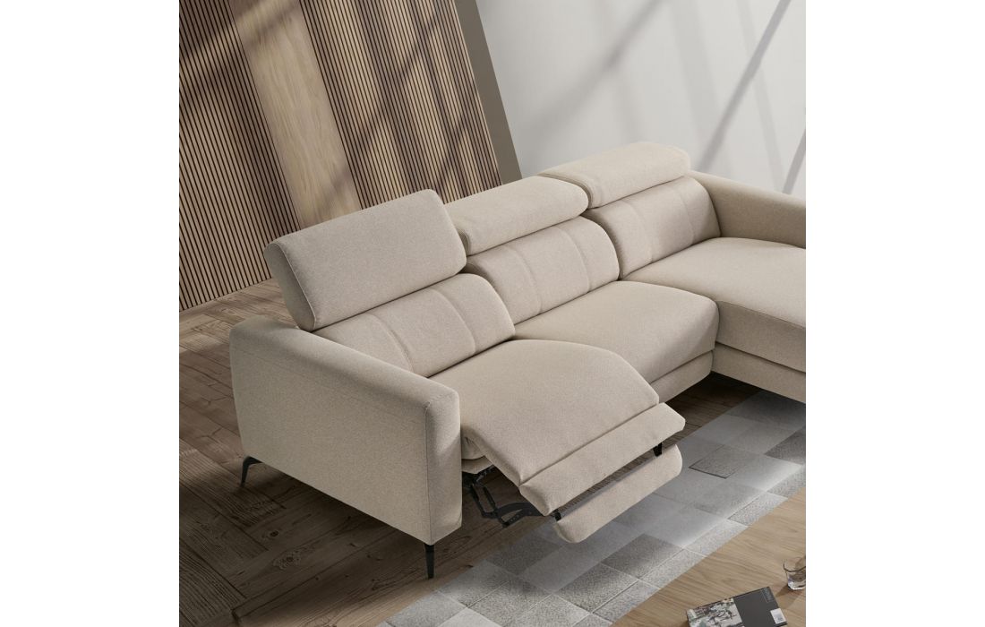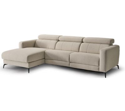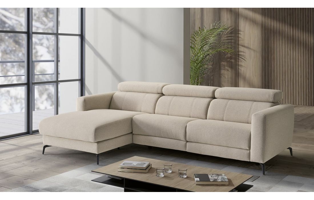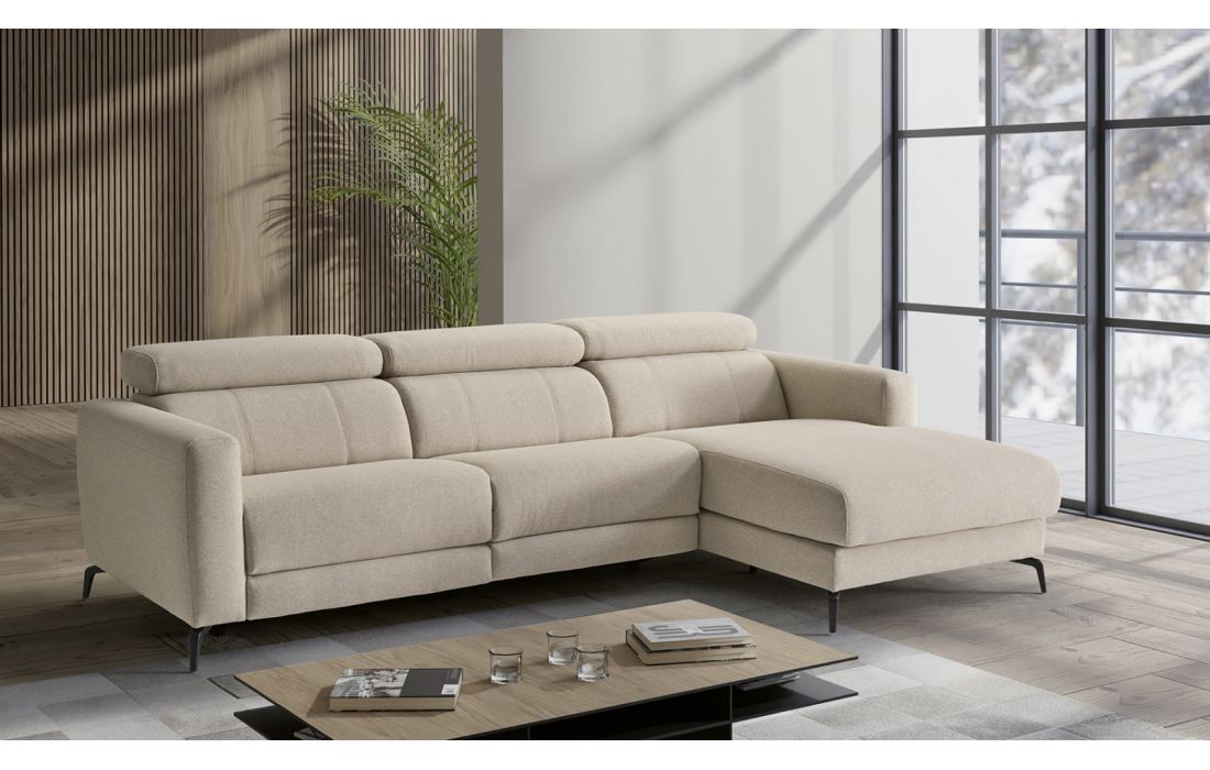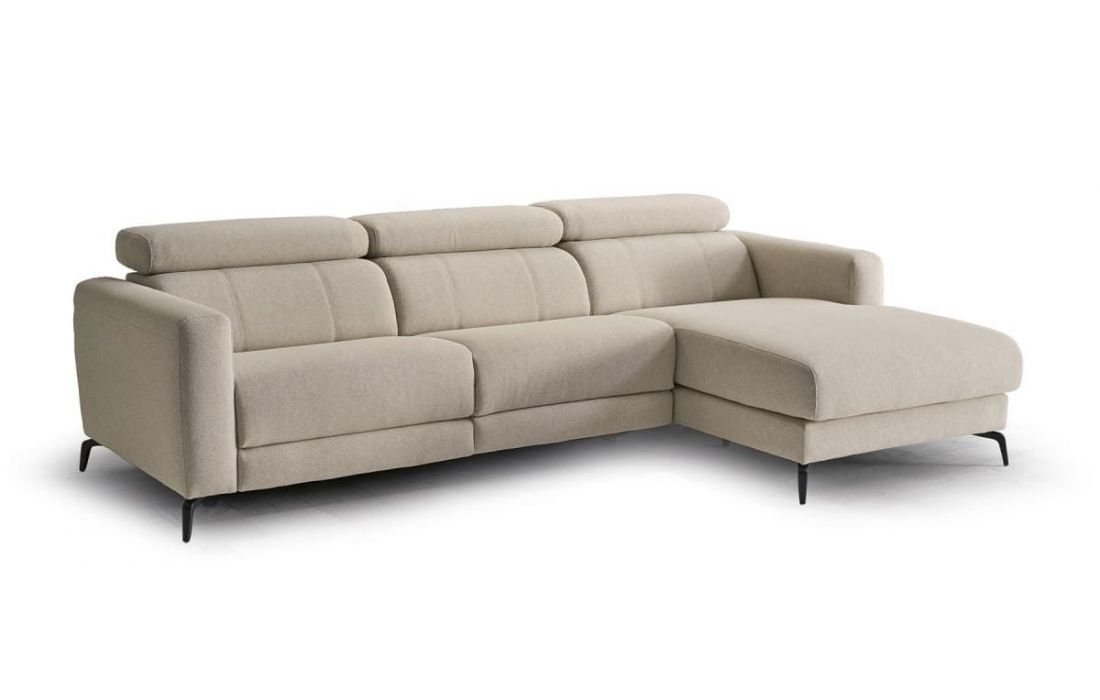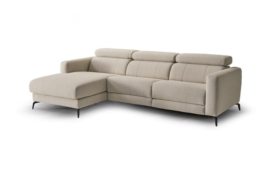 Sofá de 3 lugares com chaiselongue, estrutura em madeira forrada a tecido com pés de metal preto e 2 relaxs incluídos.