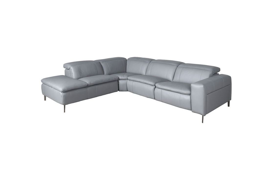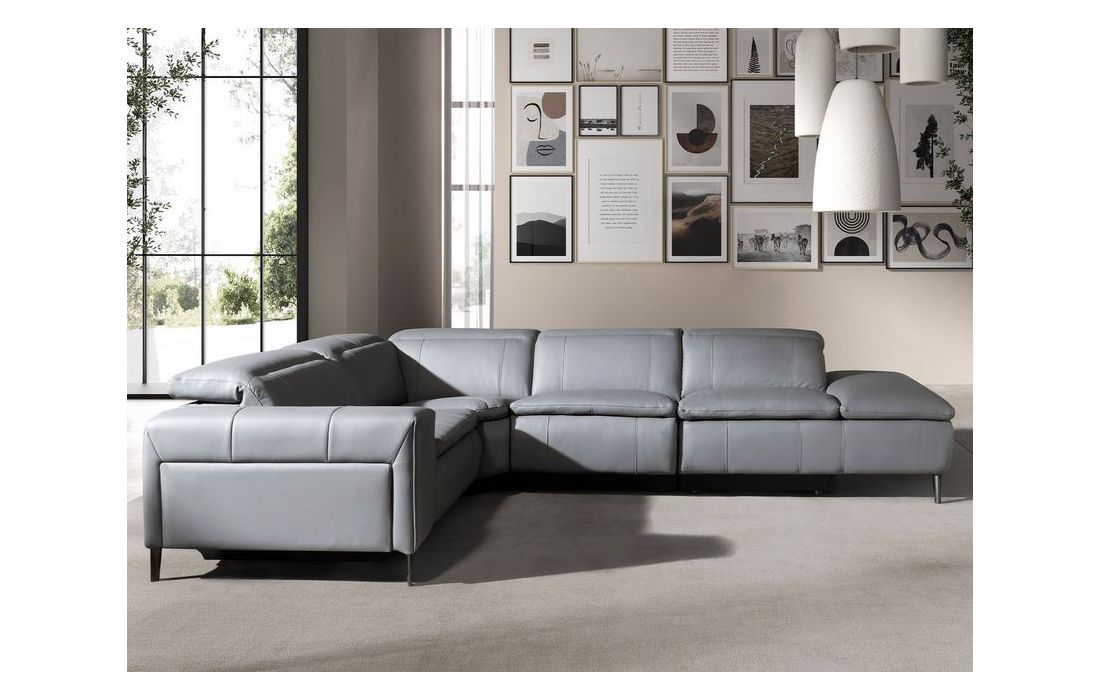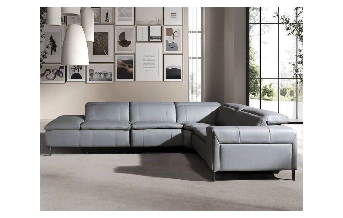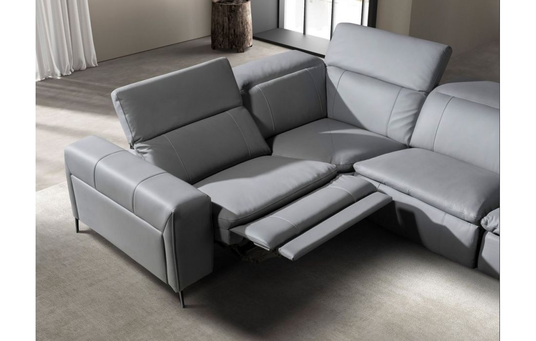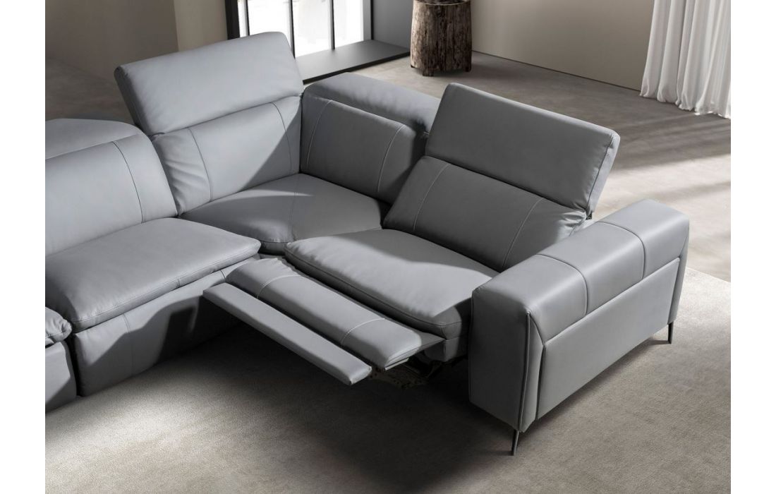 Sofá relax elétrico de canto c/ chaiselong com um design moderno estofado em pele de vaca cinzenta com apoio de cabeça c/ pés em aço inoxidável polido escurecido.Destinatário :