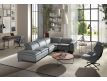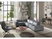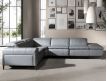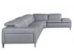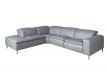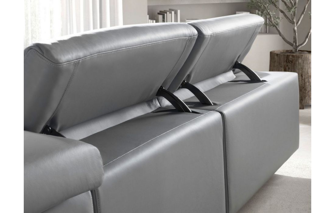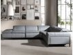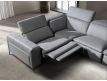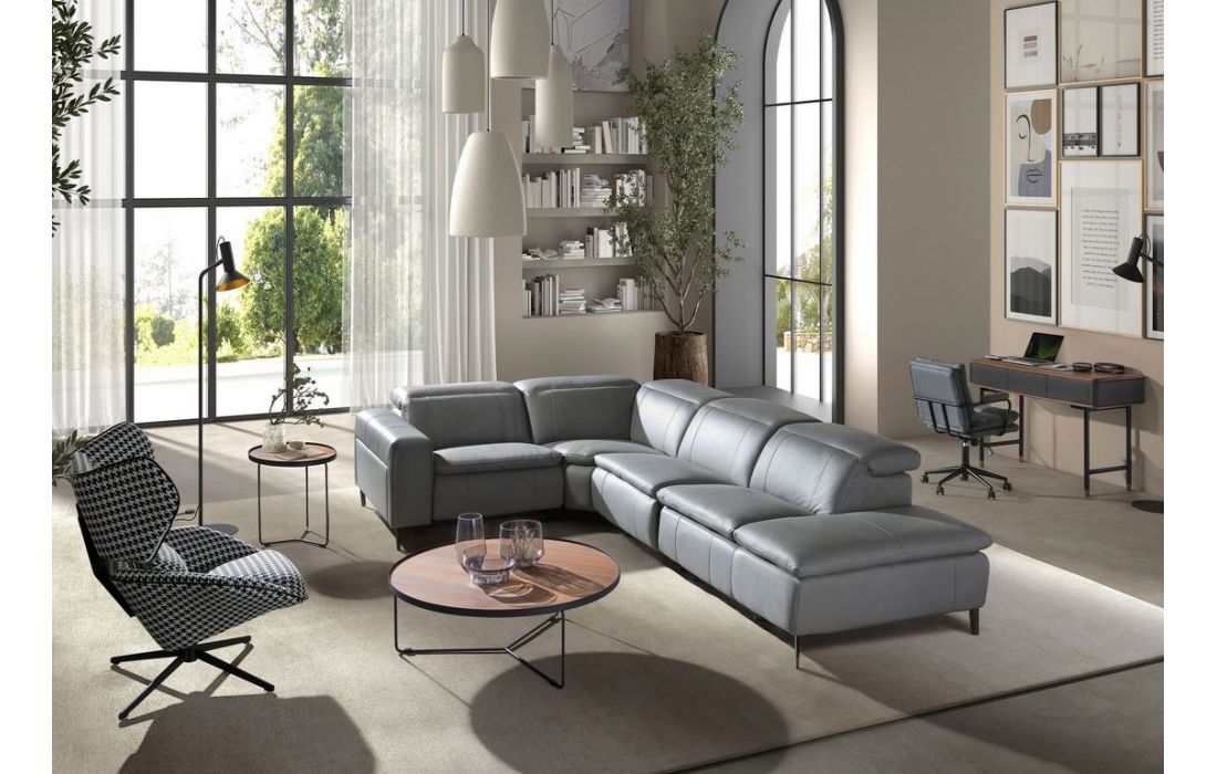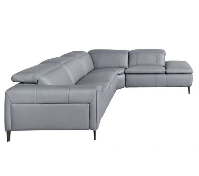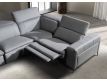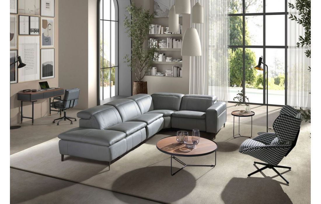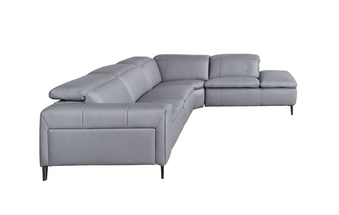 Sofá relax elétrico de canto c/ chaiselong com um design moderno estofado em pele de vaca cinzenta com apoio de cabeça c/ pés em aço inoxidável polido escurecido.Destinatário :