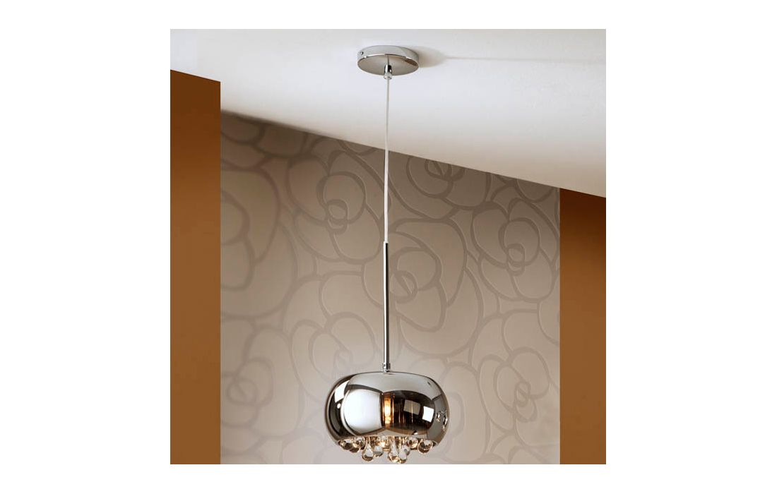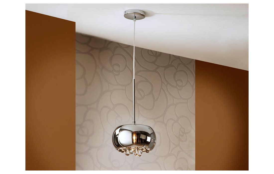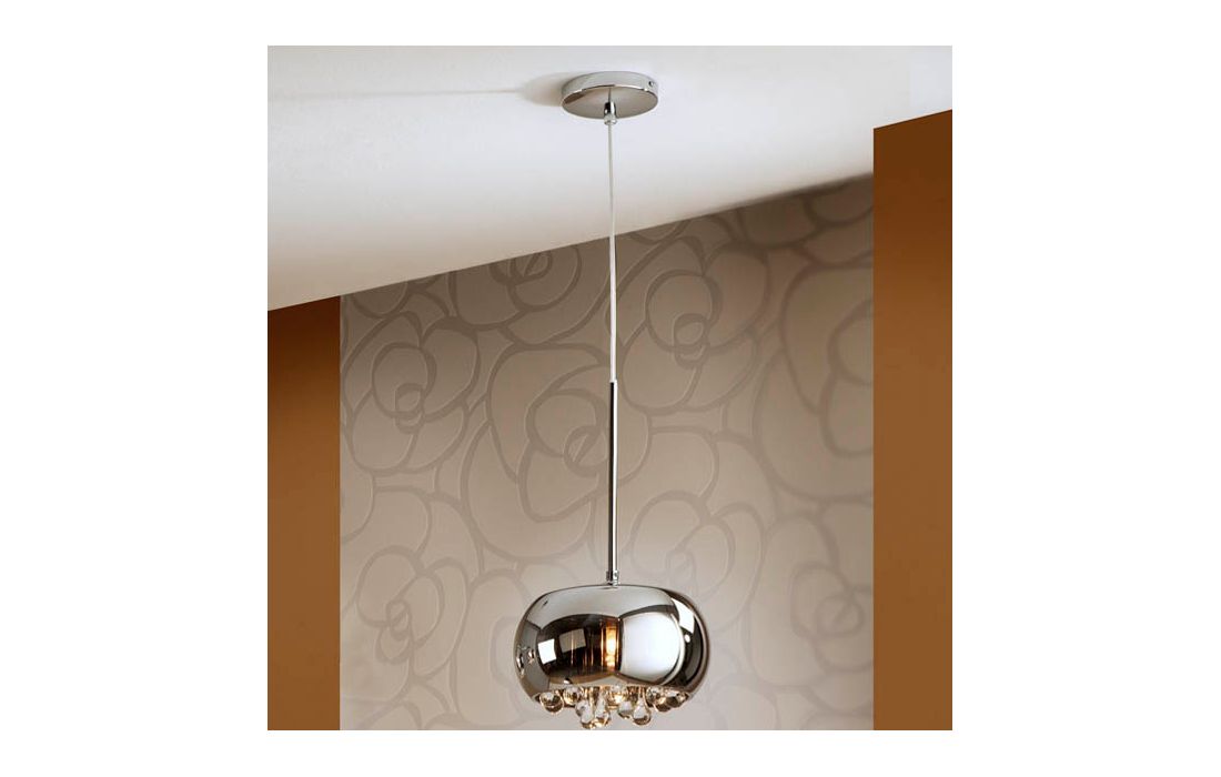 Candeeiro em metal com acabamento em cromado, com tulipa de vidro espelhado e lagrimas interiores em vidro tipo murano