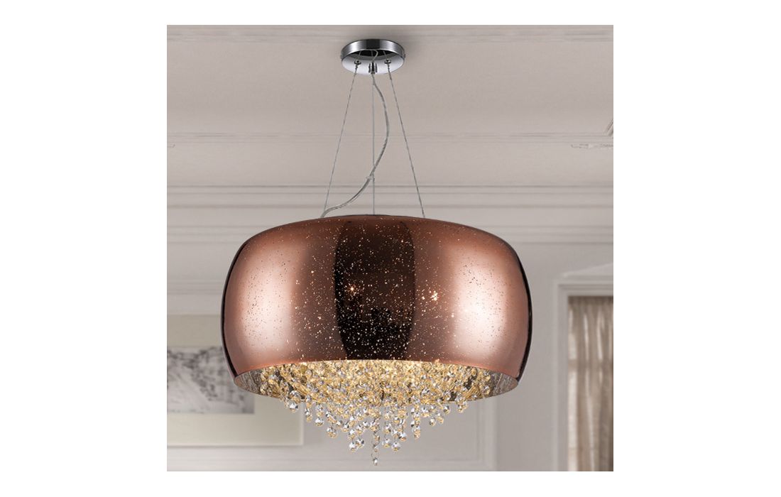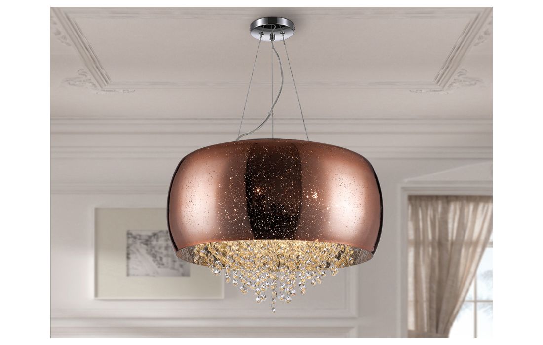 Candeeiro em metal com acabamento em cromado, tulipa em cristal decorada em cor cobre espelhado e interior com tiras de cristal facetado.