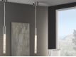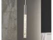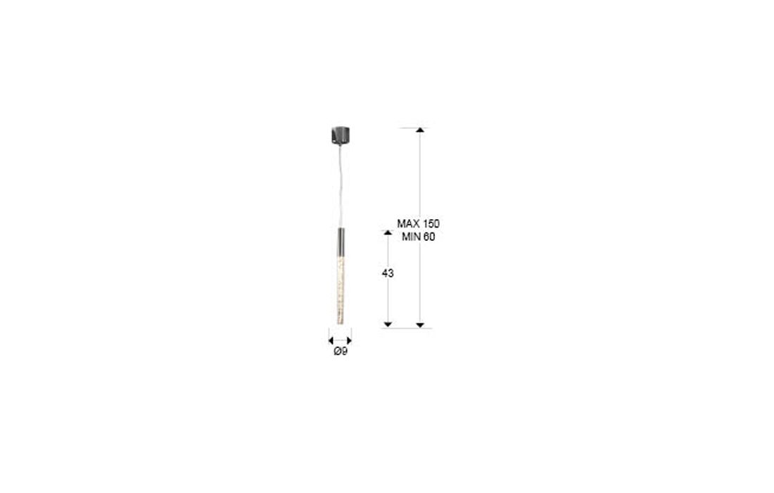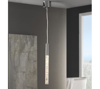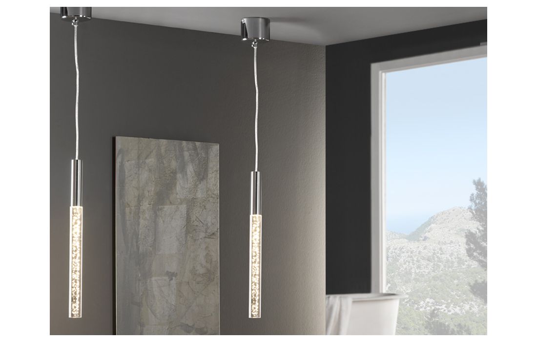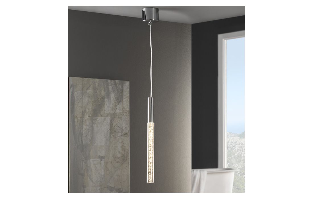 Candeeiro em metal com acabamento cromado brilhante e luz LED, com barras de acrílico transparente e bolhas interiores.