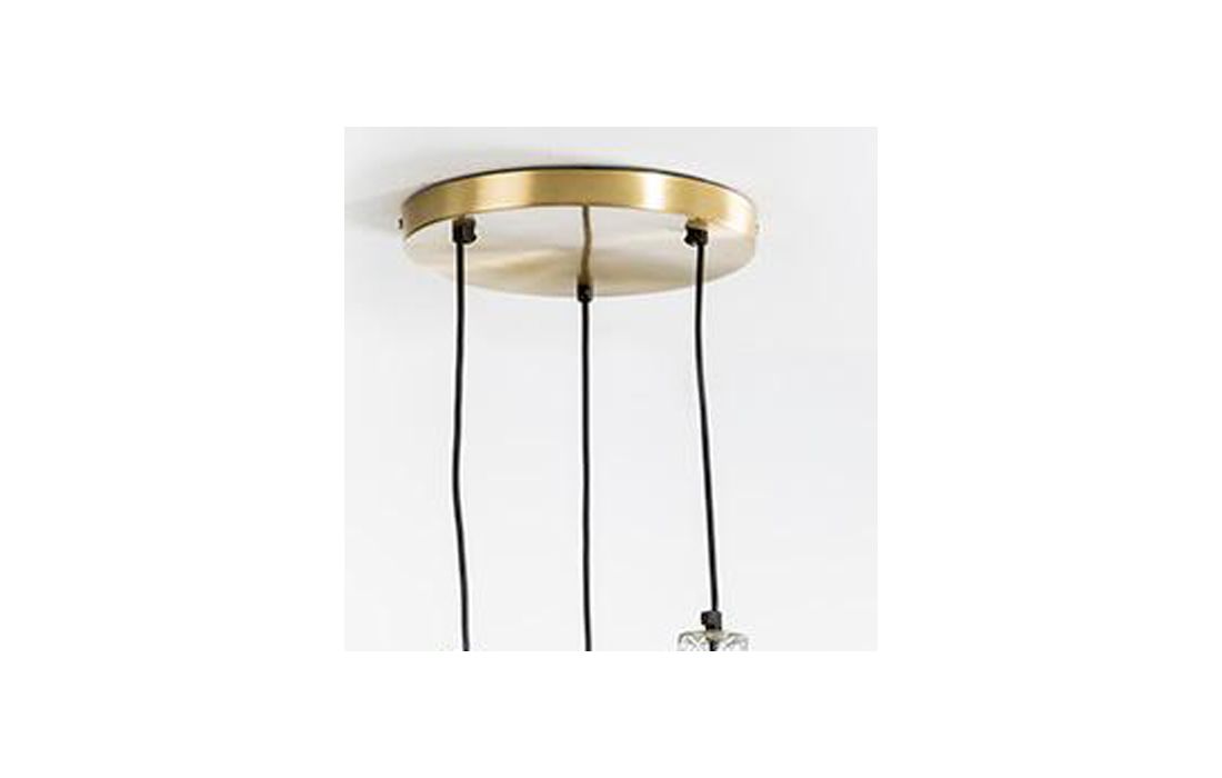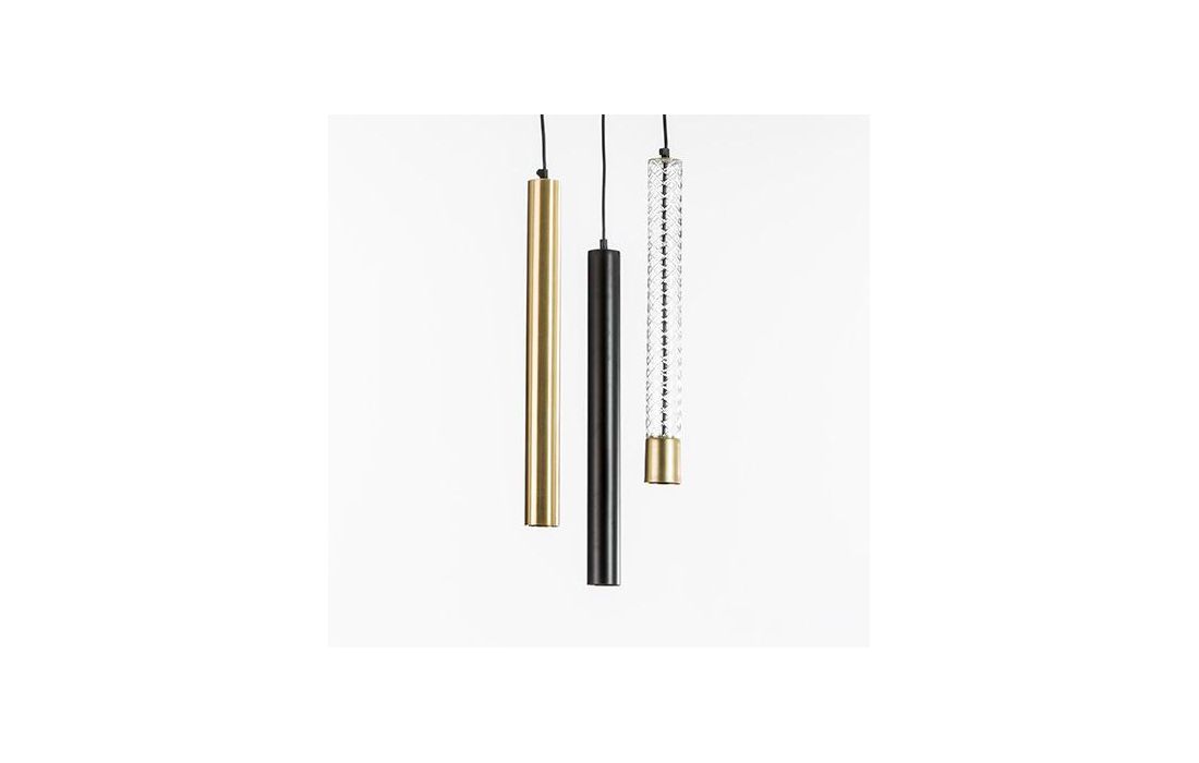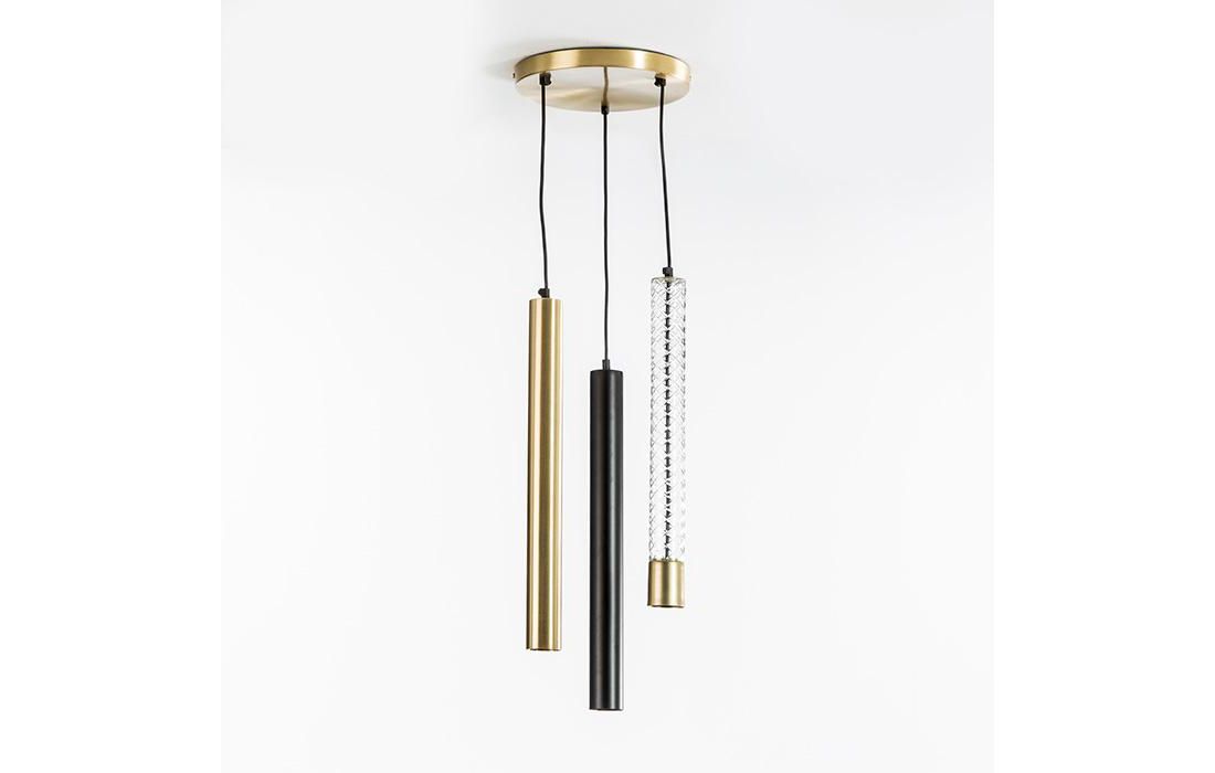Candeeiro de teto sem abajur com 3 tubos em vidro, metal bronze e preto.