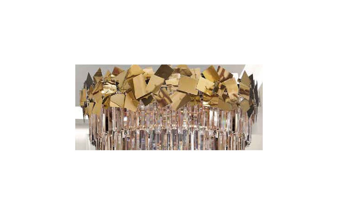Candeeiro de teto em cristal e latão dourado faz com que o mesmo se torne luxuoso e se adapte a espaços amplos e clássicos, desde hall de entrada a salas de jantar.