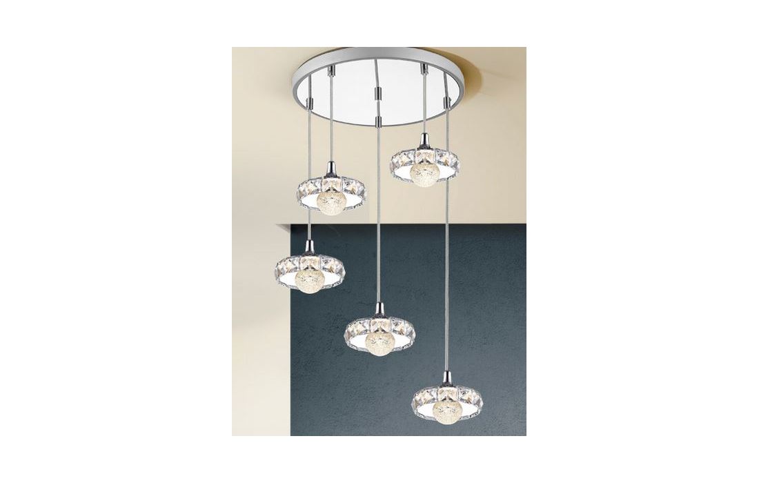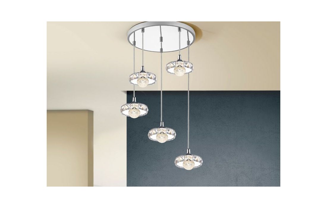 Candeeiro de teto LED de 5 luzes em metal acabamento crómio. Tulipas redondas com aro cromado, exterior de vidro facetado transparente e difusor esférico com interior texturizado.