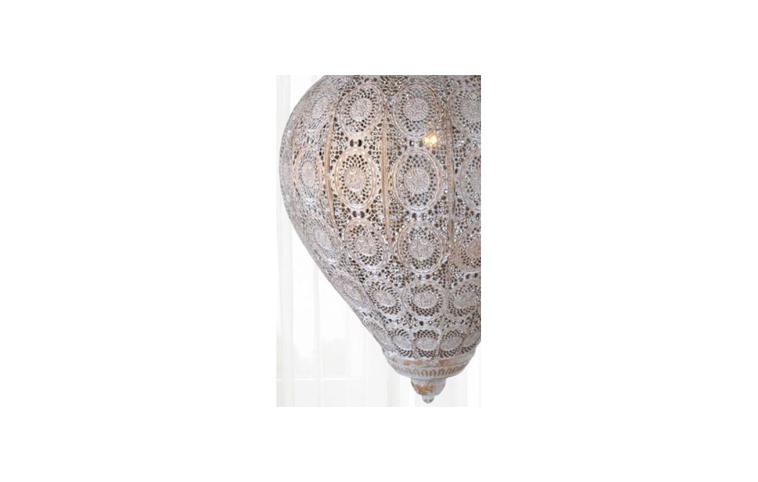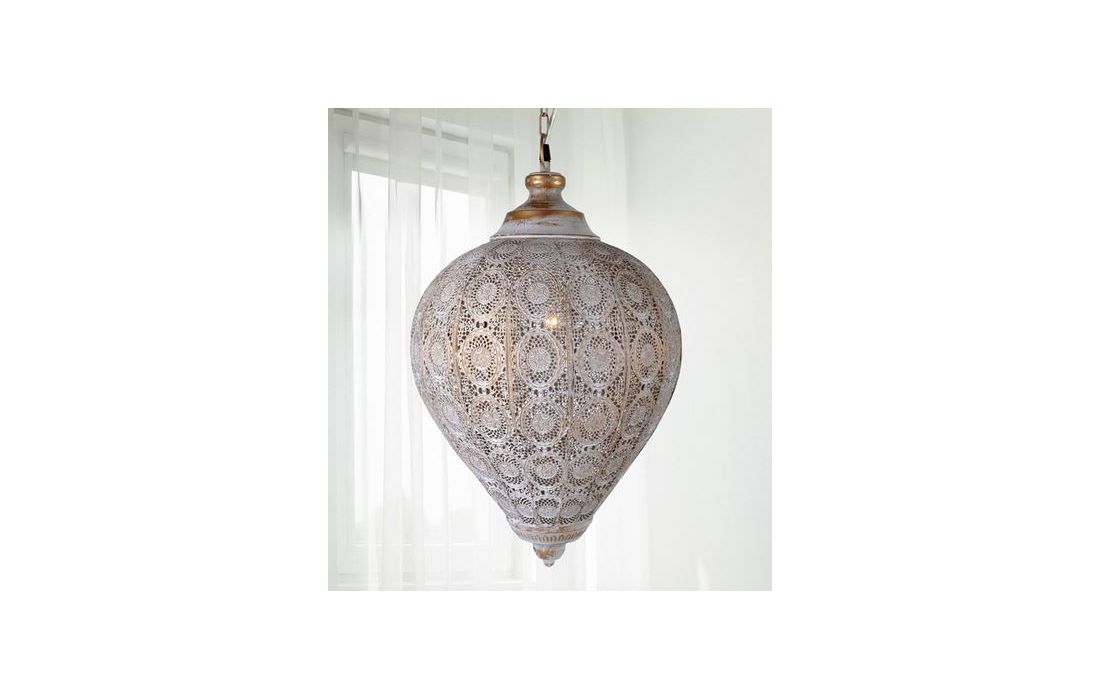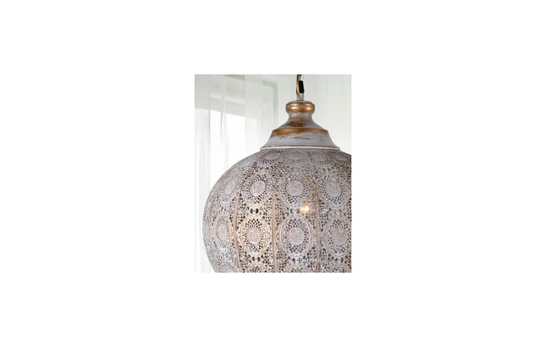 Candeeiro de teto de 1 luz em metal extrudado, acabamento cor champanhe, com detalhes dourados e pátina branca.