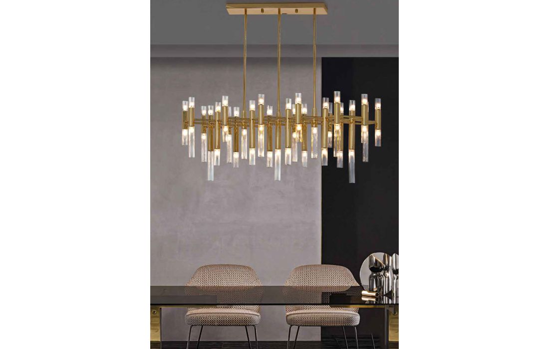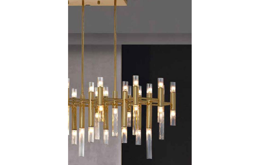 Candeeiro de teto com tons em dourado. Ideal para espaços amplos, sendo mais adaptável para salas de jantar ou mesmo salas de estar.