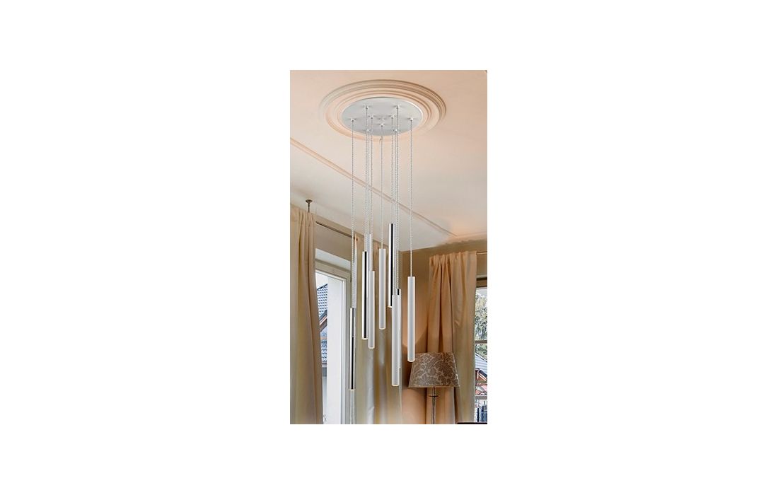 Candeeiro redondo de 9 luzes LED. Feito em metal acabado a crómado e branco mate. Difusor acrílico opaco.REGULÁVEL. Inclui comando à distancia.