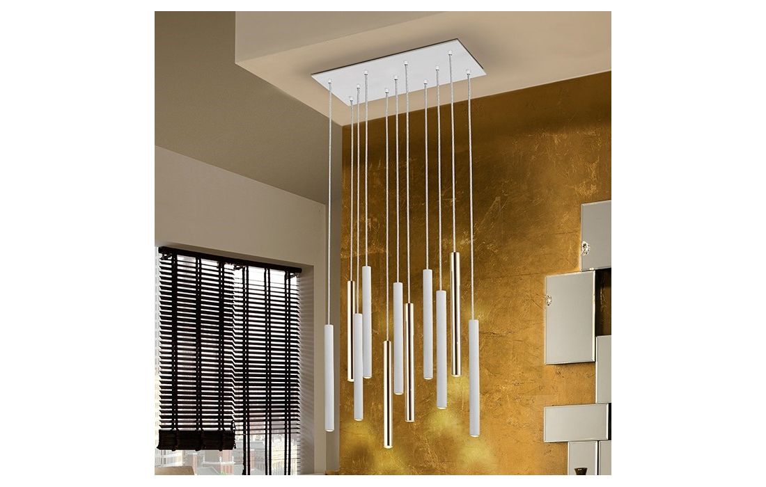 Candeeiro de 11 luzes LED. Feito em metal acabado ouro e branco mate. Difusor acrílico opaco. REGULÁVEL. Inclui comando à distancia.