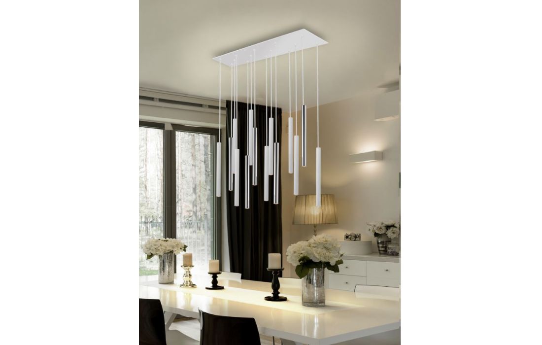 Candeeiro de 14 luzes LED. Feito em metal acabado a crómado e branco mate. Difusor acrílico opaco.REGULÁVEL. Inclui comando à distancia.