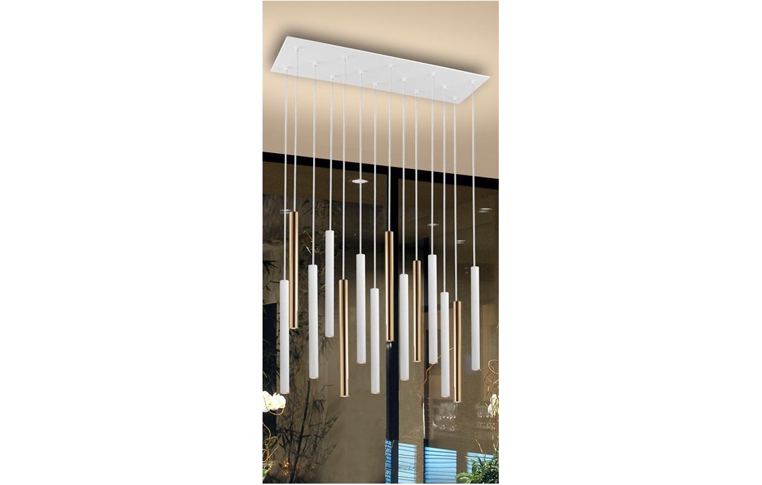 Candeeiro de 14 luzes LED. Feito em metal acabado a ouro brilho e branco mate. Difusor acrílico opaco. REGULÁVEL. Inclui comando à distancia