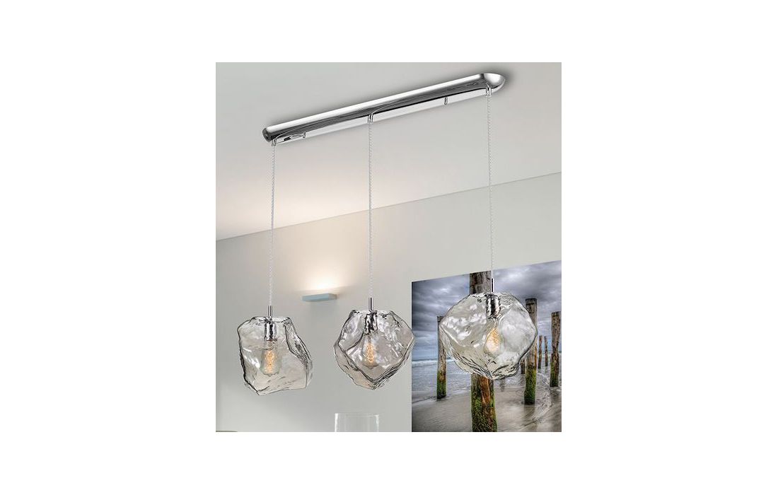 Candeeiro de 3 luzes, realizado em metal acabamento crómio. Tulipas grandes de vidro tom smoke claro. Reguláveis em altura.