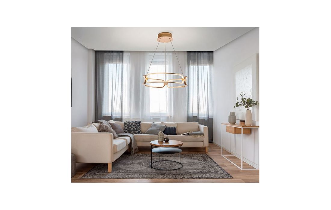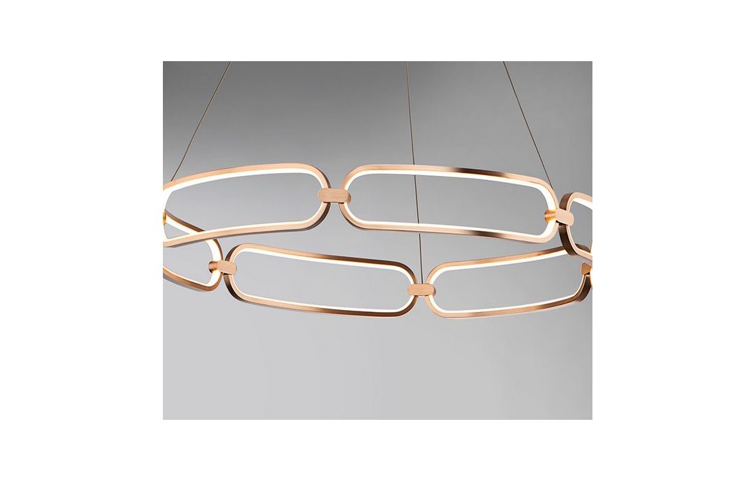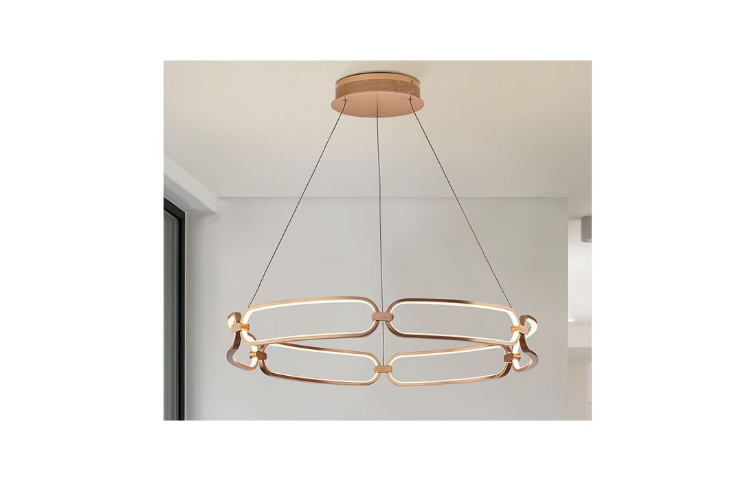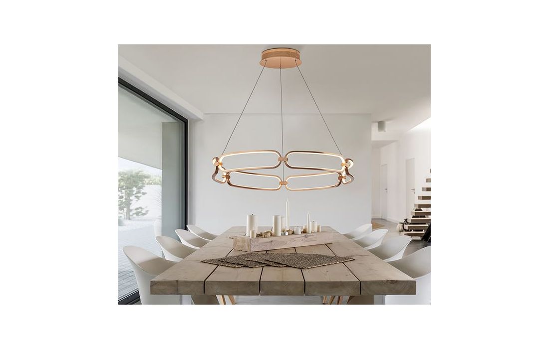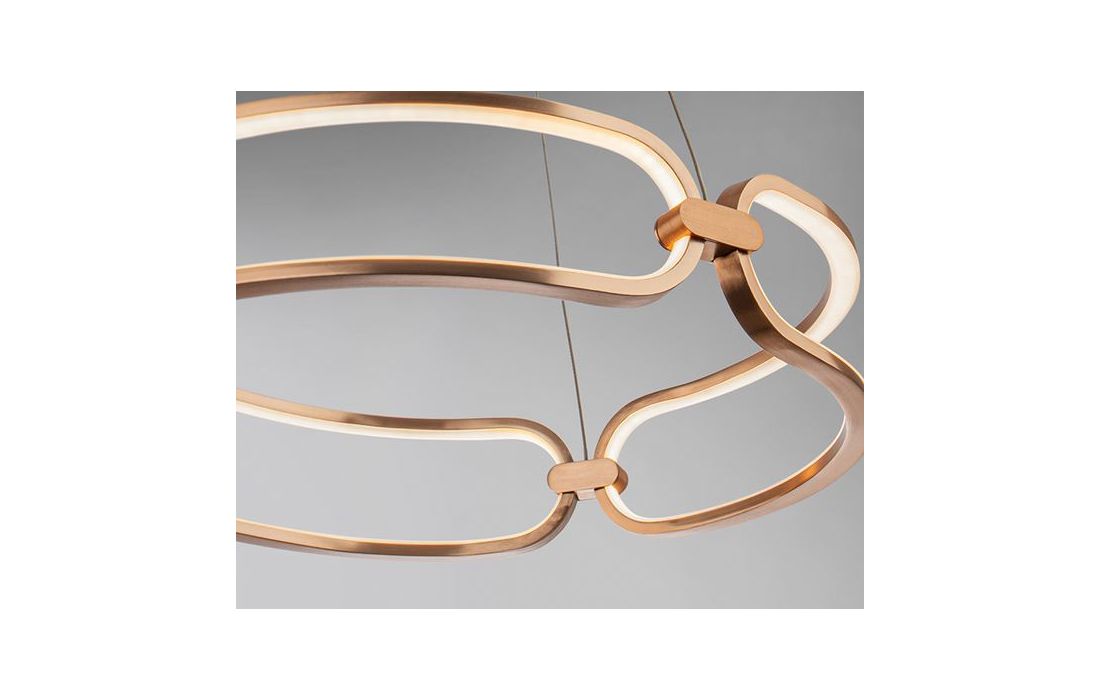 Candeeiro de teto LED, realizado em alumínio escovado com acabamento dourado. Difusores de silicone opalino. Regulável em altura. Disponivel em tamanho grande e pequeno.