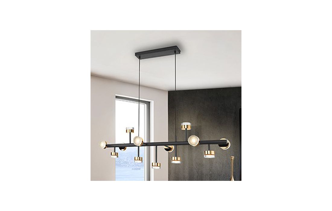 Candeeiro de teto LED em metal acabamento preto mate. Tulipas cilíndricas com base de metal dourado e difusor de acrílico transparente. REGULÁVEL. Inclui comando à distancia.