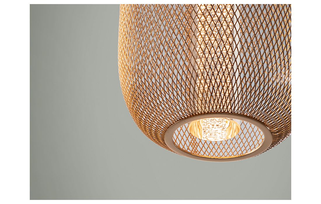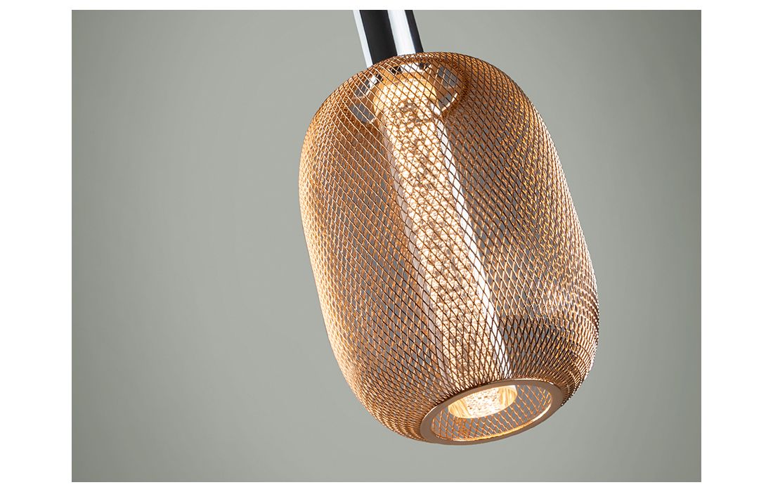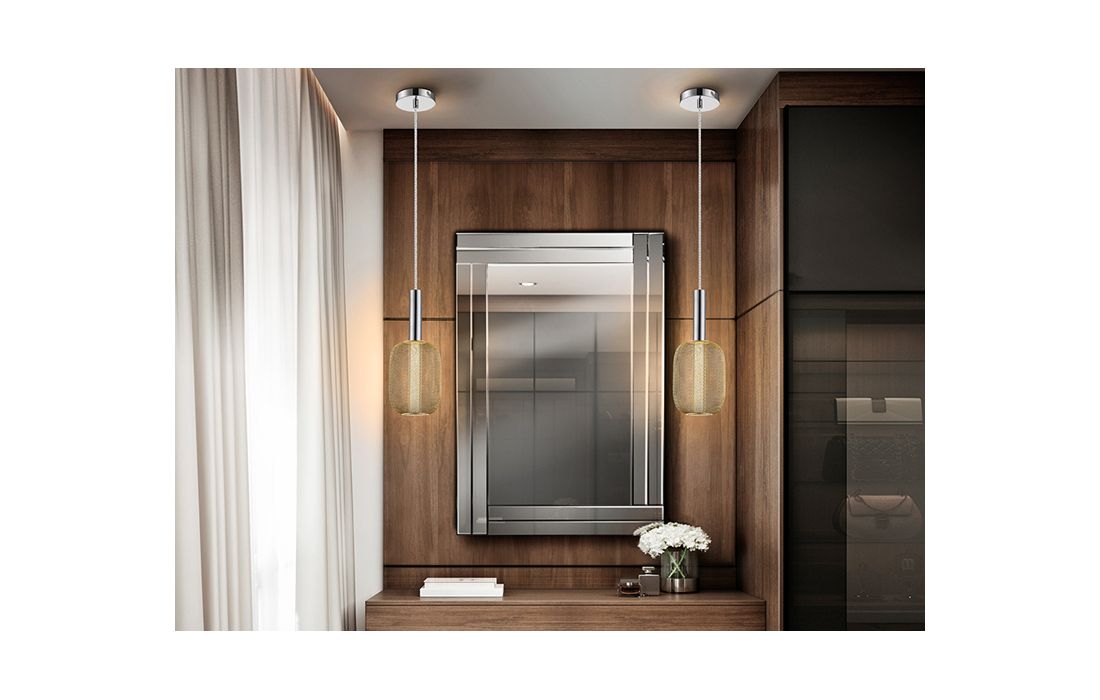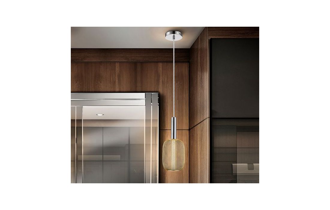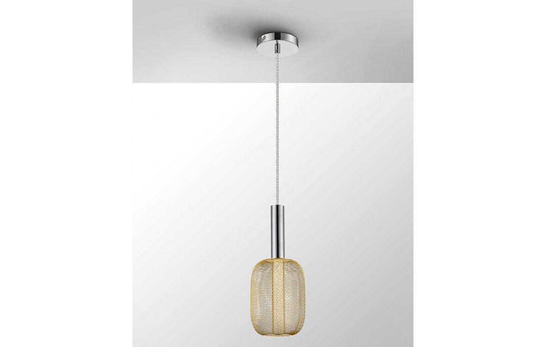 Candeeiro de teto LED de 1 luz em metal cromado. Dupla tulipa com cilindro interior de acrílico transparente com bolhas e óvalo exterior de rede metálica dourado brilhante.