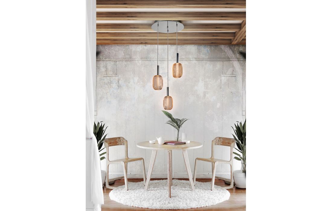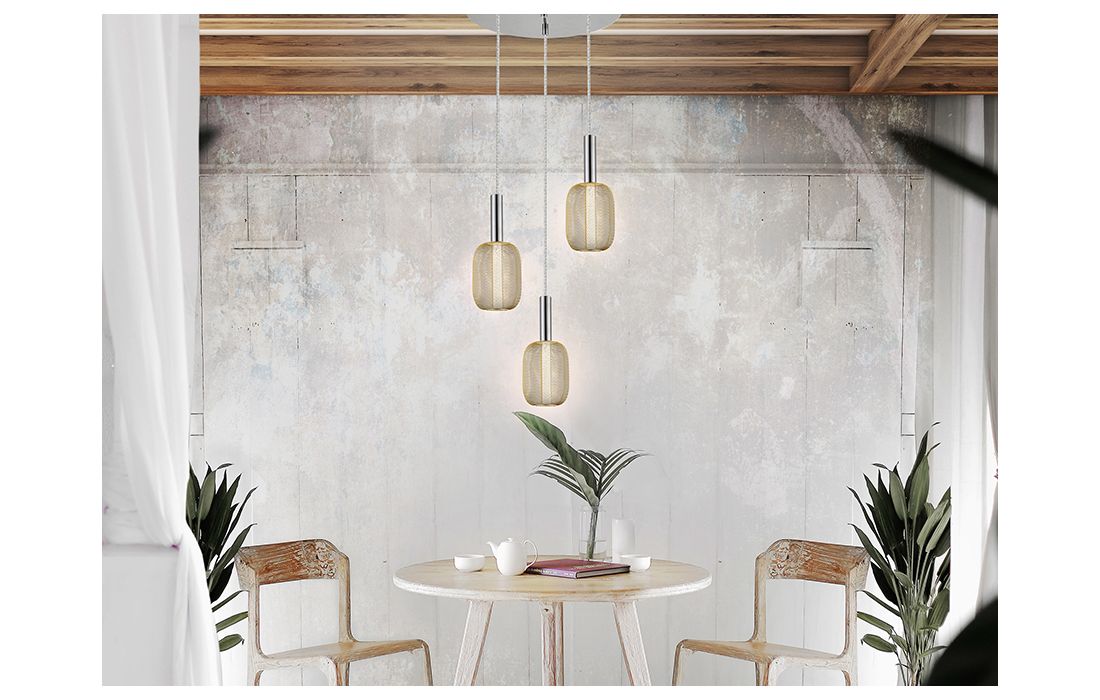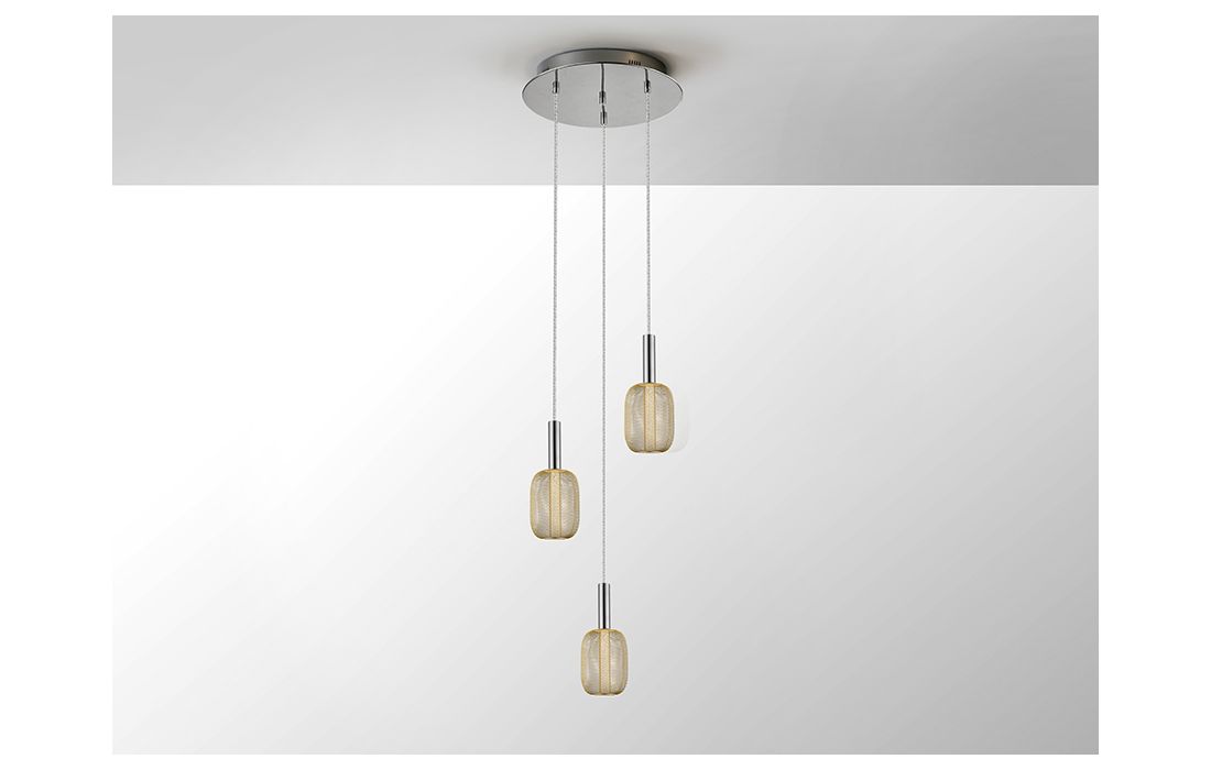 Candeeiro de teto LED de 3 luz em metal cromado. Dupla tulipa com cilindro interior de acrílico transparente com bolhas e óvalo exterior de rede metálica dourado brilhante.