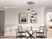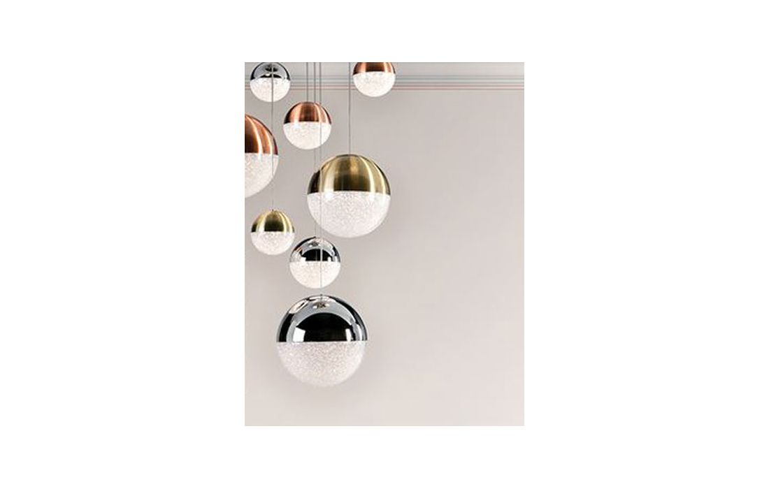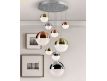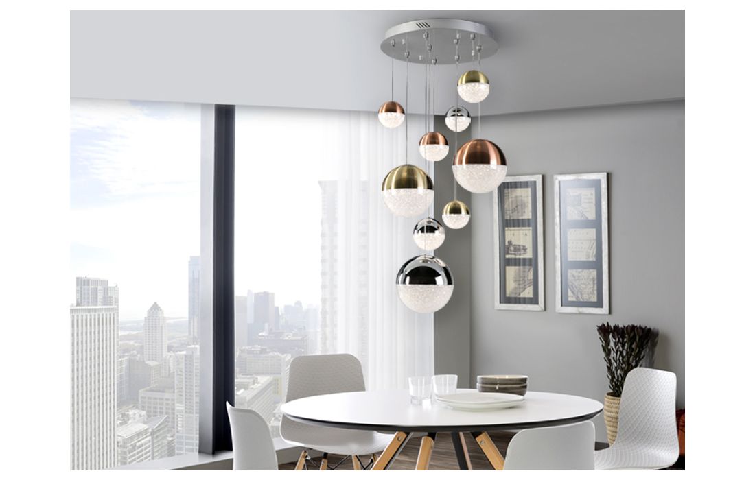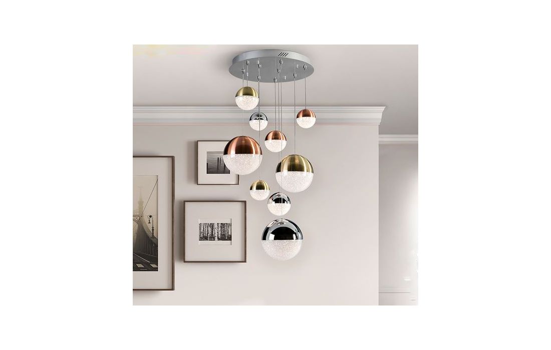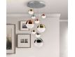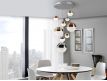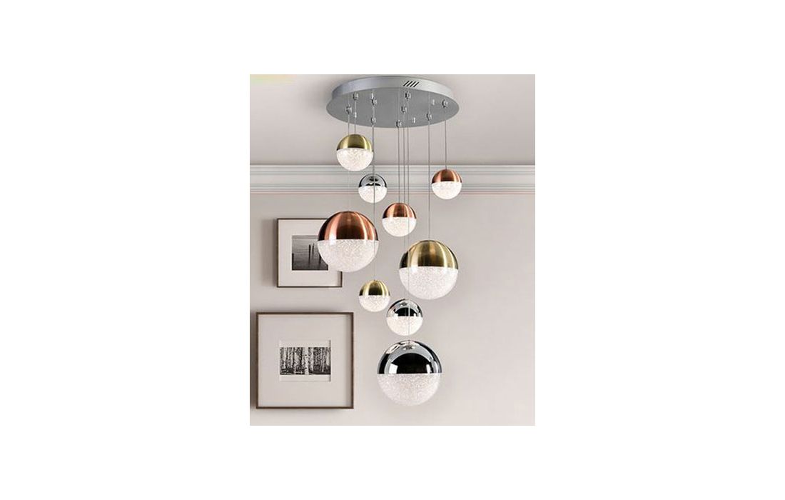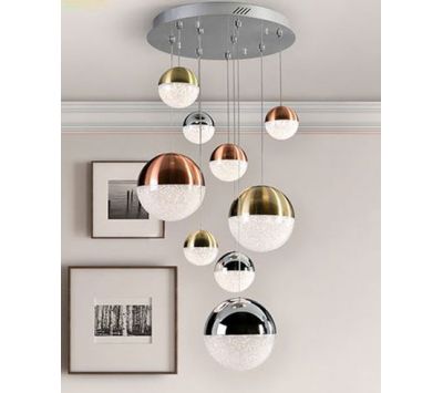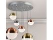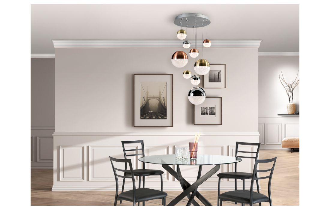 Candeeiro de teto com 9 luzes LED, em metal, acabamento crómio. Tulipas esféricas de Ø10 cm, 12Ø cm, Ø20 cm, de policarbonato com interior texturizado e metal, acabamento em cobre e latão acetinados e crómio. Altura regulável.