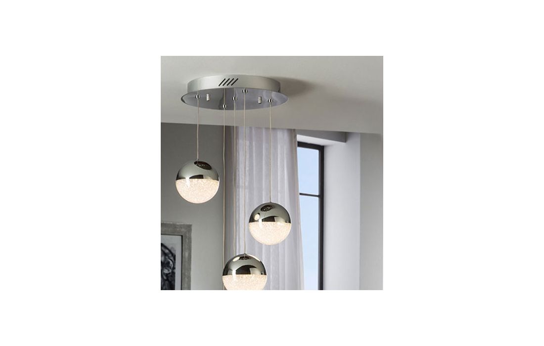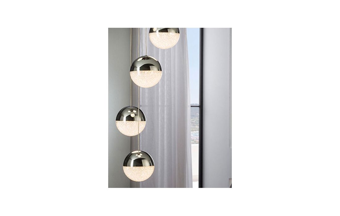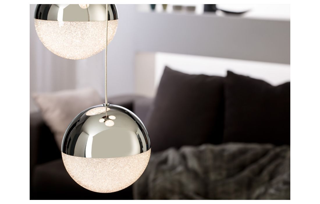 Candeeiro de teto com 5 luzes, realizado em metal acabamento crómio. Tulipas esféricas de Ø12 cm de metal e policarbonato com interior texturizado. Altura regulável.