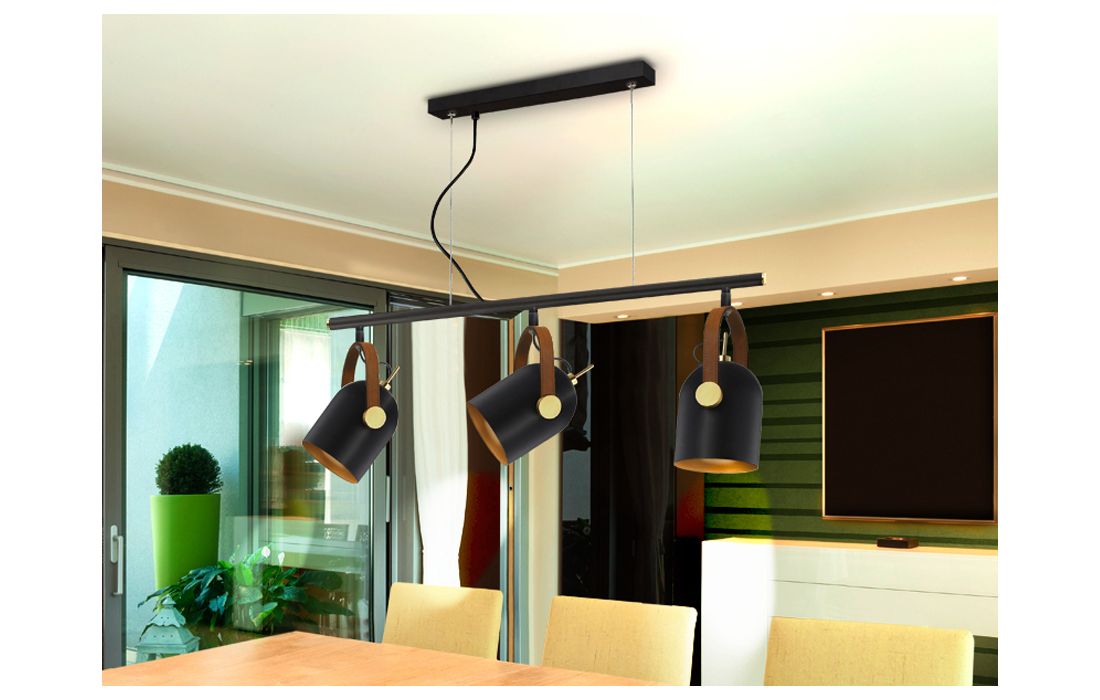 Candeeiro de teto 3 luzes em metal acabamento preto mate e dourado, com detalhes em latão polido, pega forrada em couro sintético cor castanha. Focos giratórios.