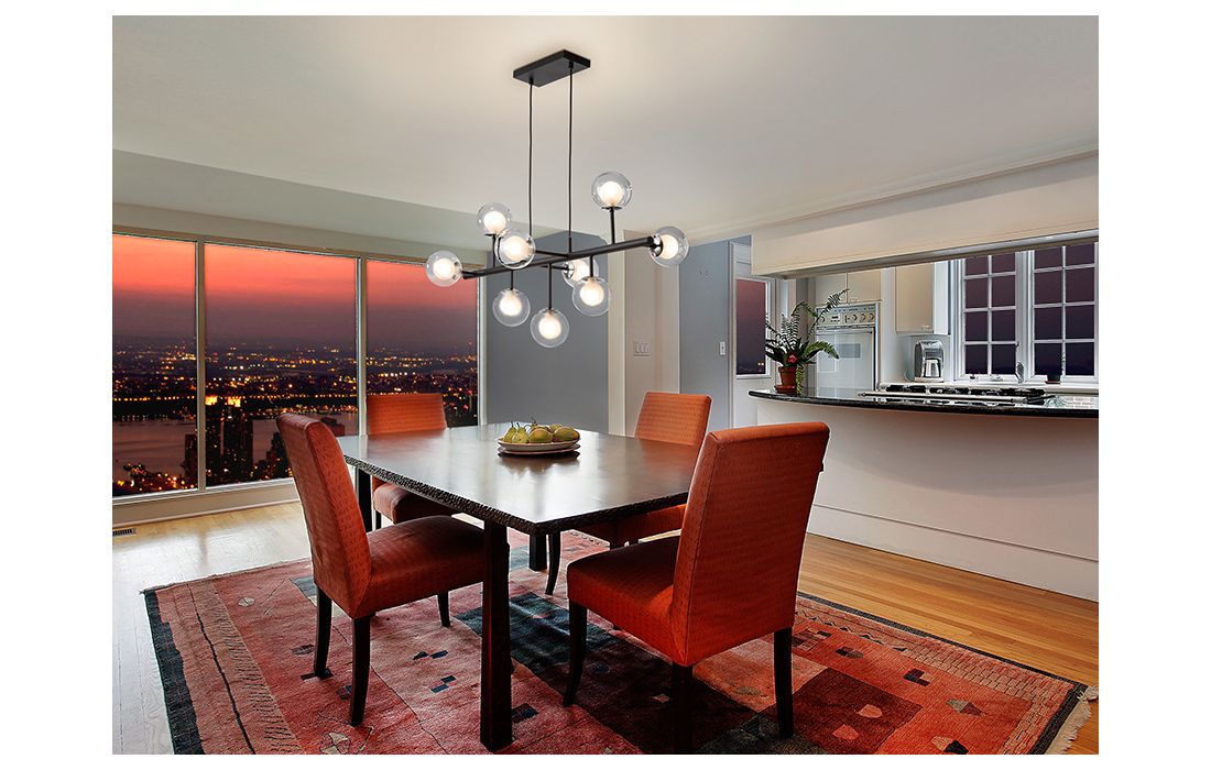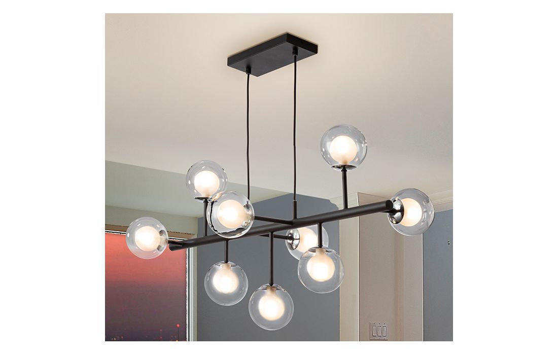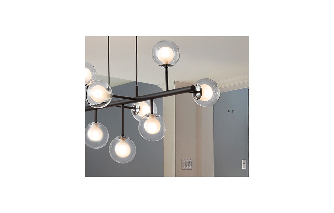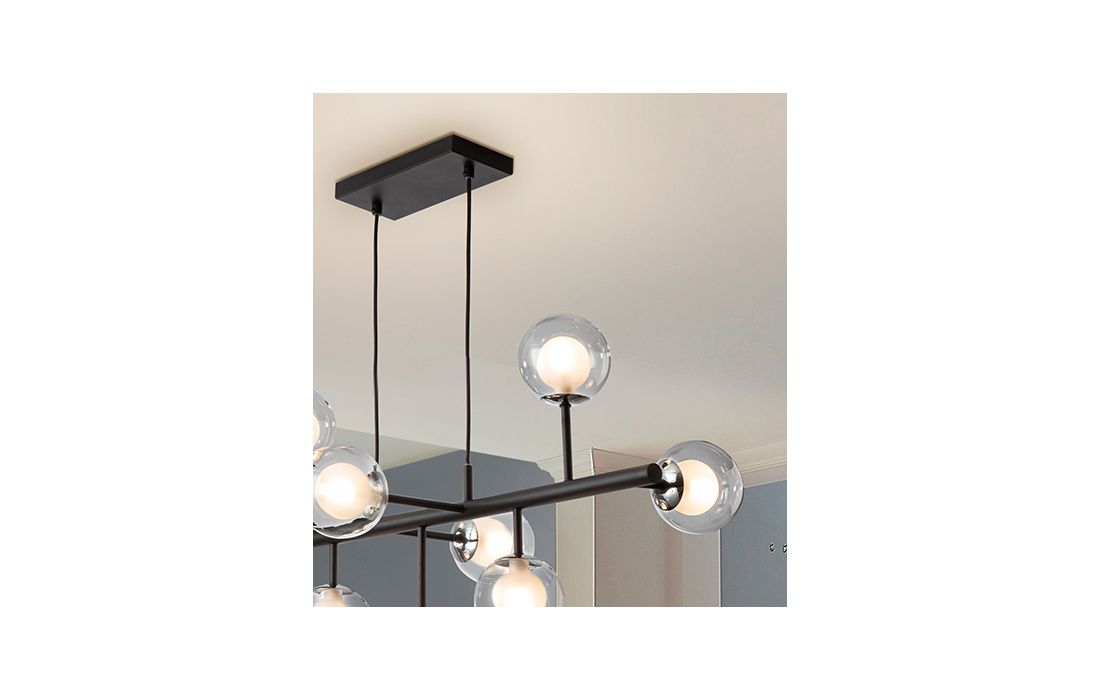 Candeeiro de teto em metal acabamento preto mate com detalhes cromados, tulipas esféricas com vidro duplo, interior opalino e exterior transparente.