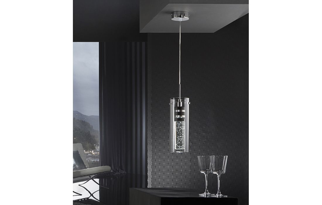 Candeeiro de teto de 1 luz realizado em metal cromado e alumínio lacado. Tulipa regulável em altura de vidro transparente e barra maciça de vidro facetado com bolhas decorativas no interior.