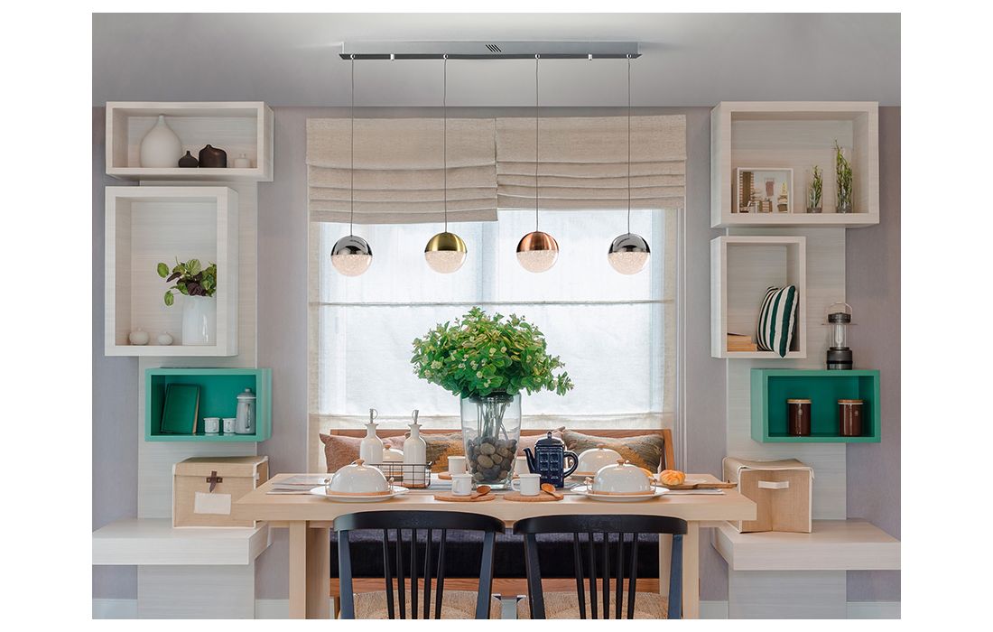 Candeeiro de teto 4 luzes LED, realizado em metal, acabamento crómio. Tulipas esféricas de 12 cm de policarbonato com interior texturizado e metal, acabamento em cobre acetinado, latão acetinado e crómio. Altura regulável.