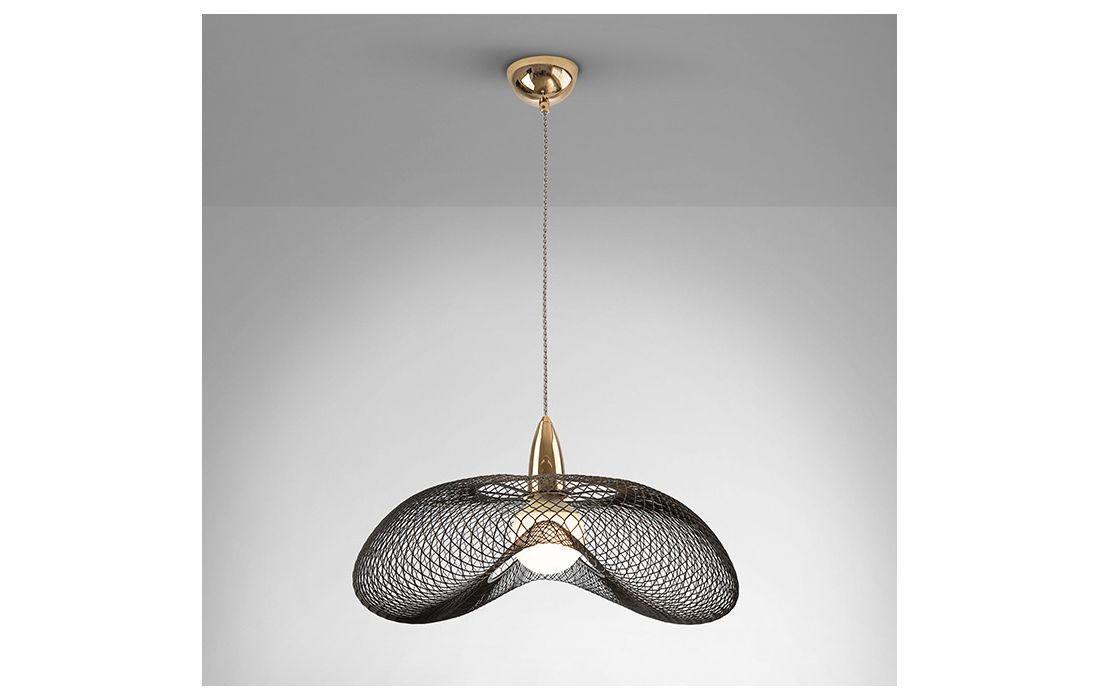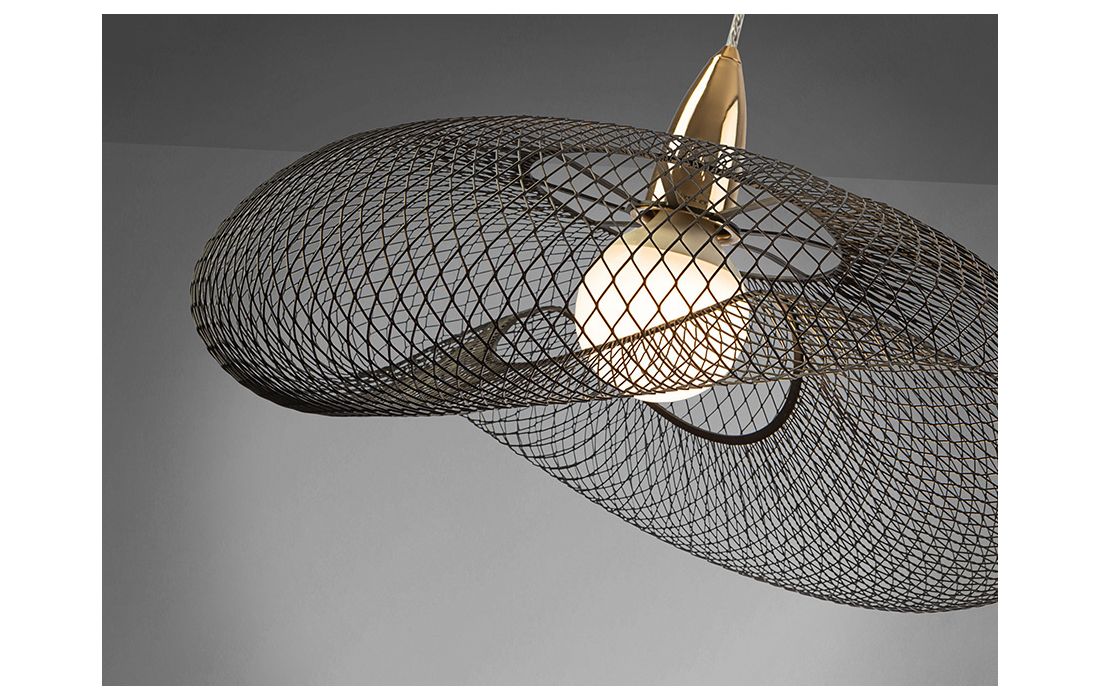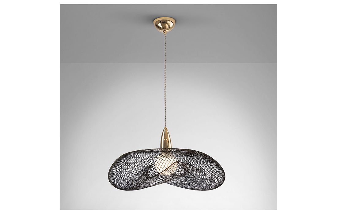 Candeeiro de teto 1 luz em metal acabamento dourado brilho e tulipa de malha metálica preta.