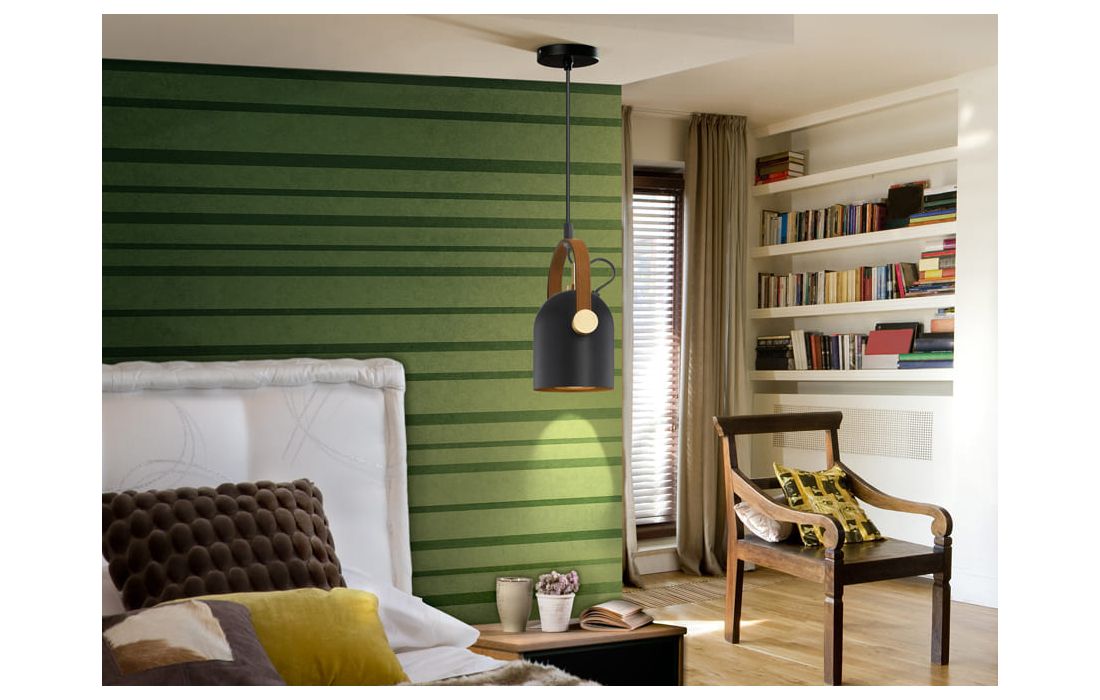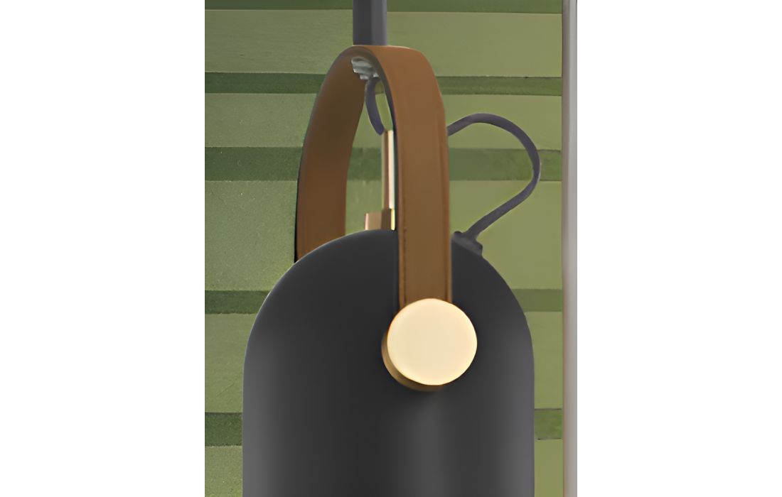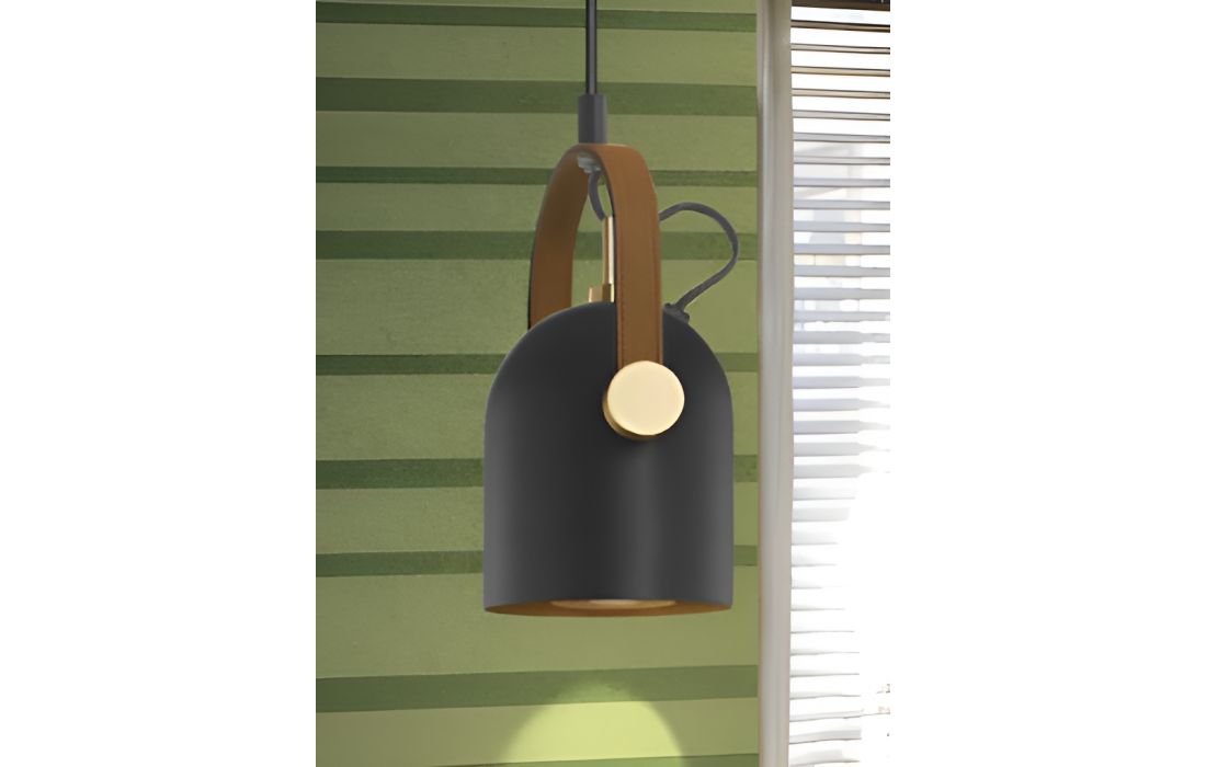 Candeeiro de teto 1 luz em metal acabamento preto mate e ouro, detalhes em latão polido, pega forrada em polipele castanha. Foco giratório