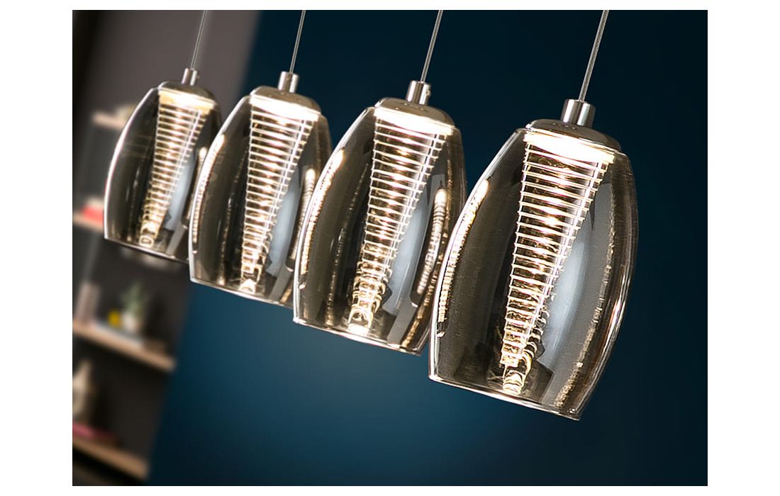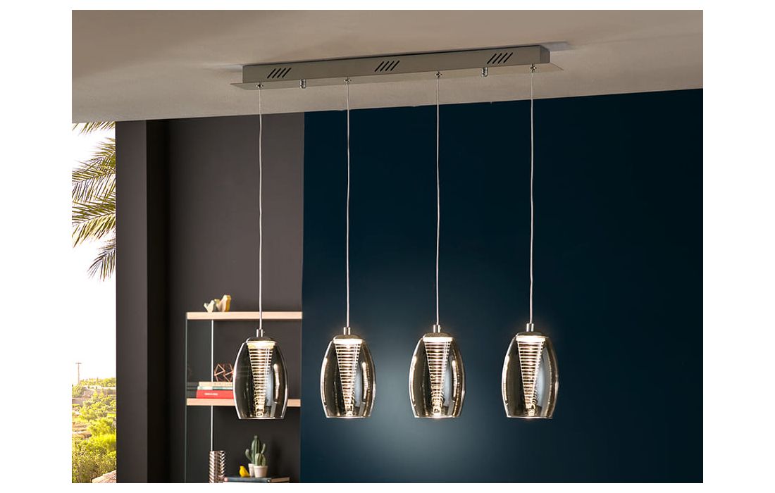 Candeeiro de teto 4 luzes em metal com acabamento crómio. Dupla tulipa, exterior em forma de pêra realizada em vidro espelhado e interior em policarbonato transparente em forma de cone escalonado. Regulável em altura.