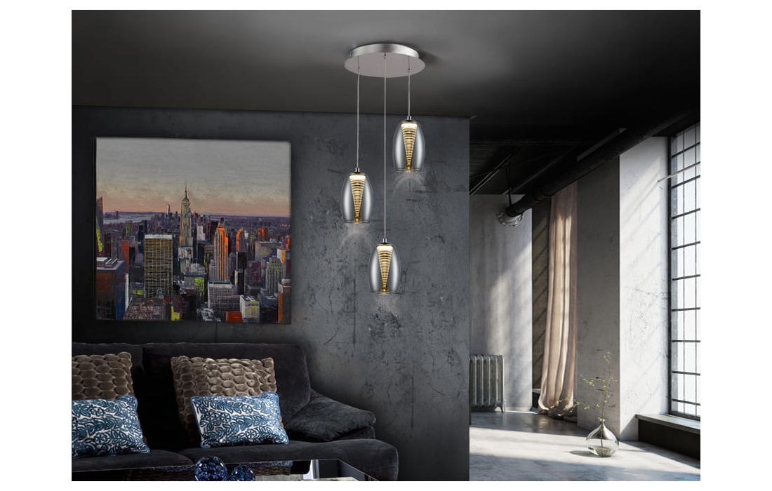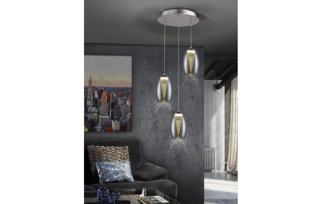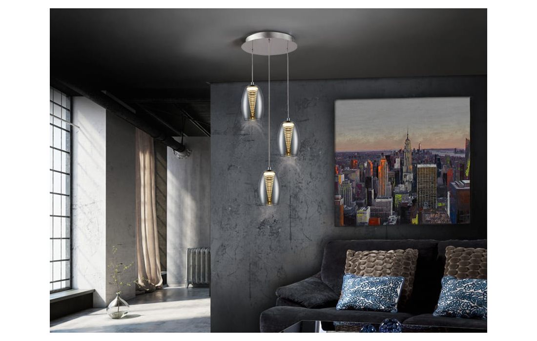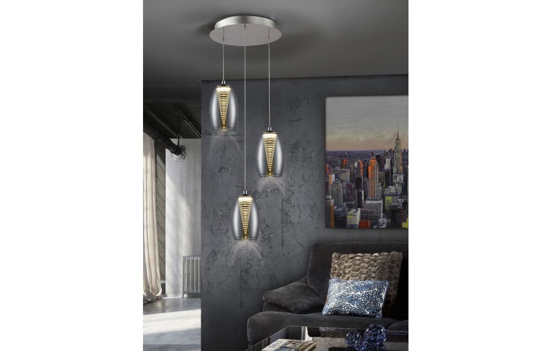 Candeeiro de teto 3 luzes em metal com acabamento crómio. Dupla tulipa, exterior realizado em vidro espelhado e interior em policarbonato transparente em forma de cone escalonado. Regulável em altura.