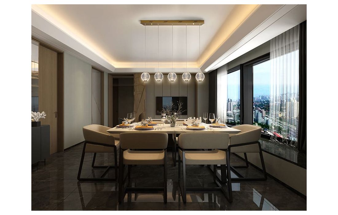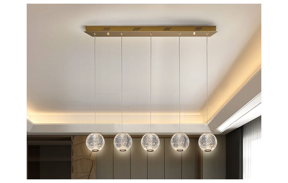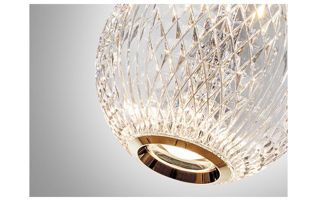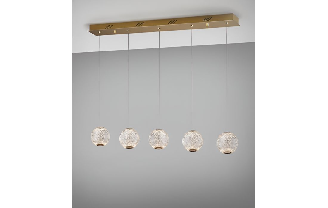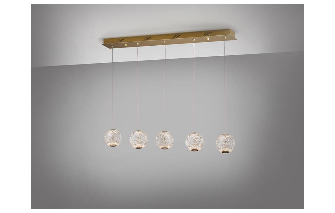 Candeeiro de teto redondo de 5 luz LED de metal com acabamento em dourado. Tulipa esférica de 11cm de acrílico ótico transparente, imitação de vidro talhado.