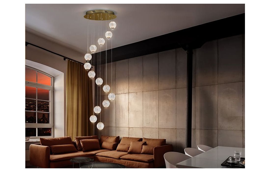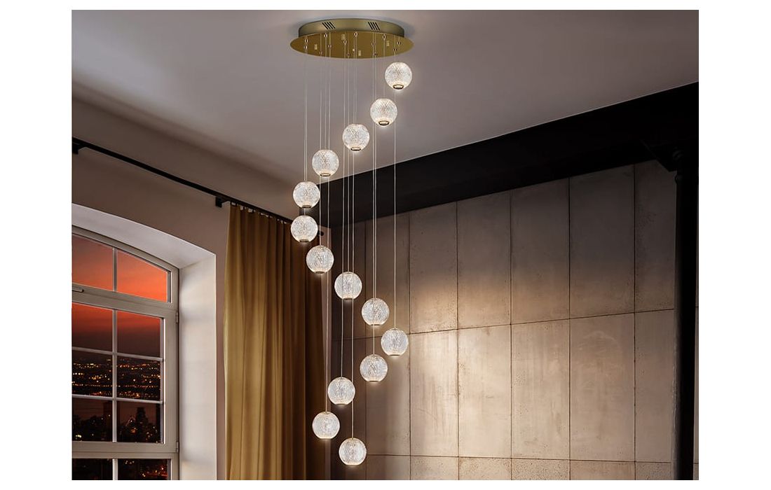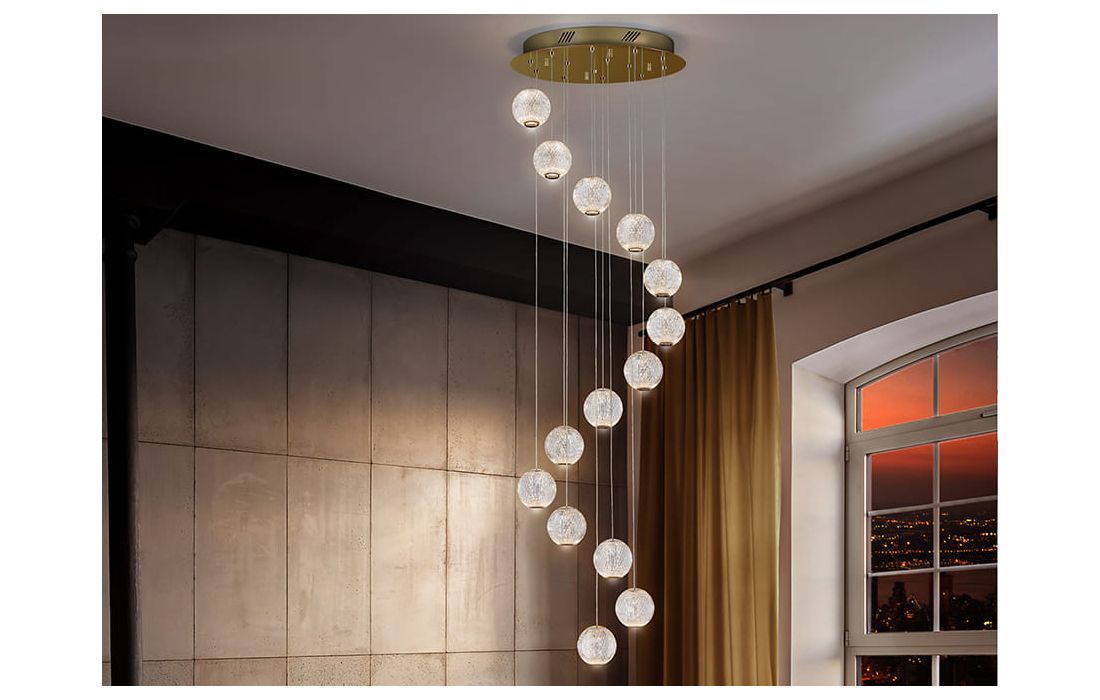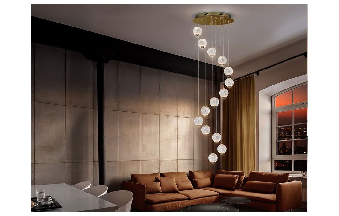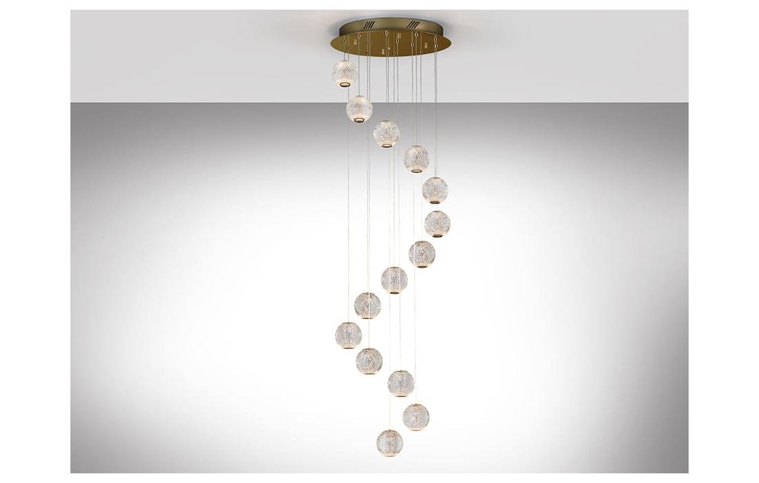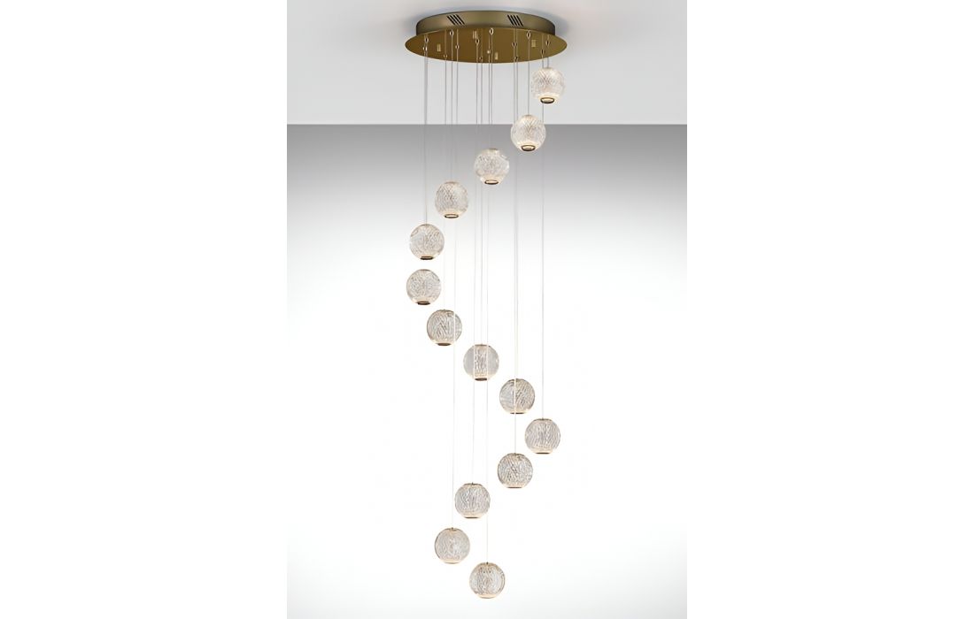 Candeeiro de teto redondo de 14 luzes LED de metal com acabamento em dourado. Tulipa esférica de 11cm de acrílico ótico transparente, design facetado.