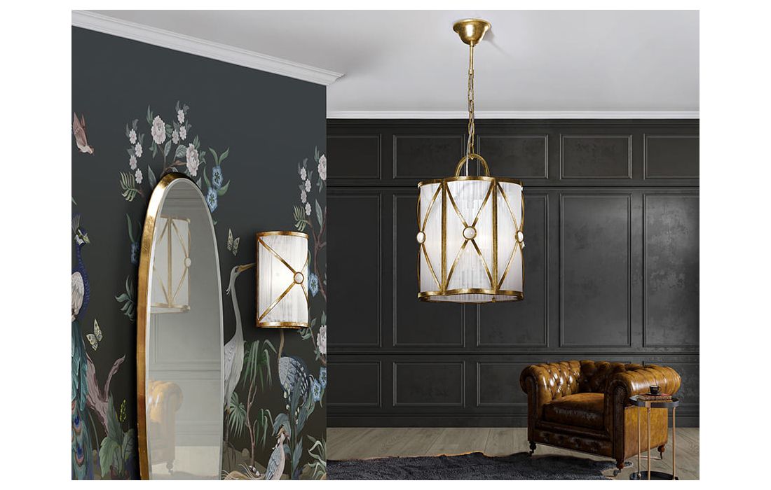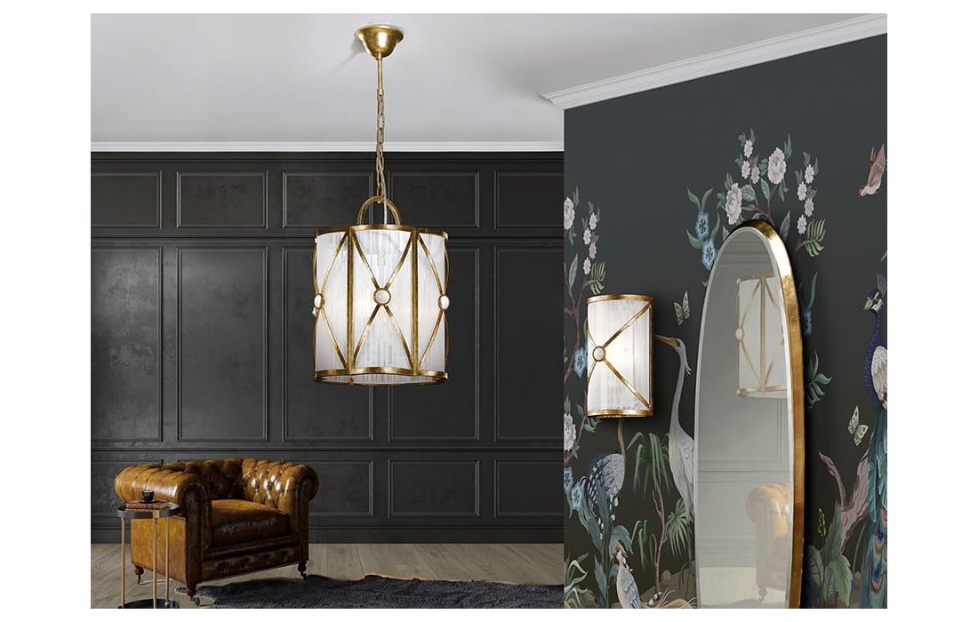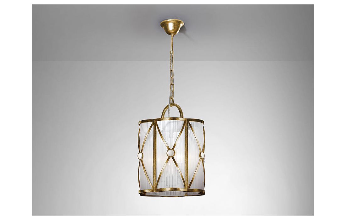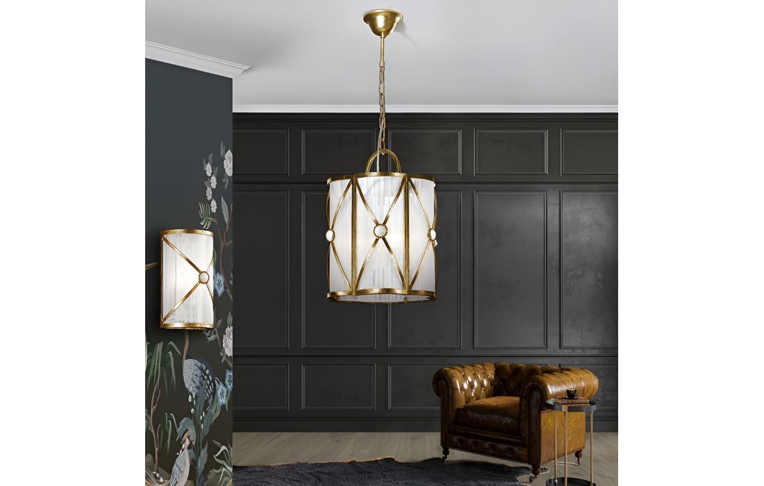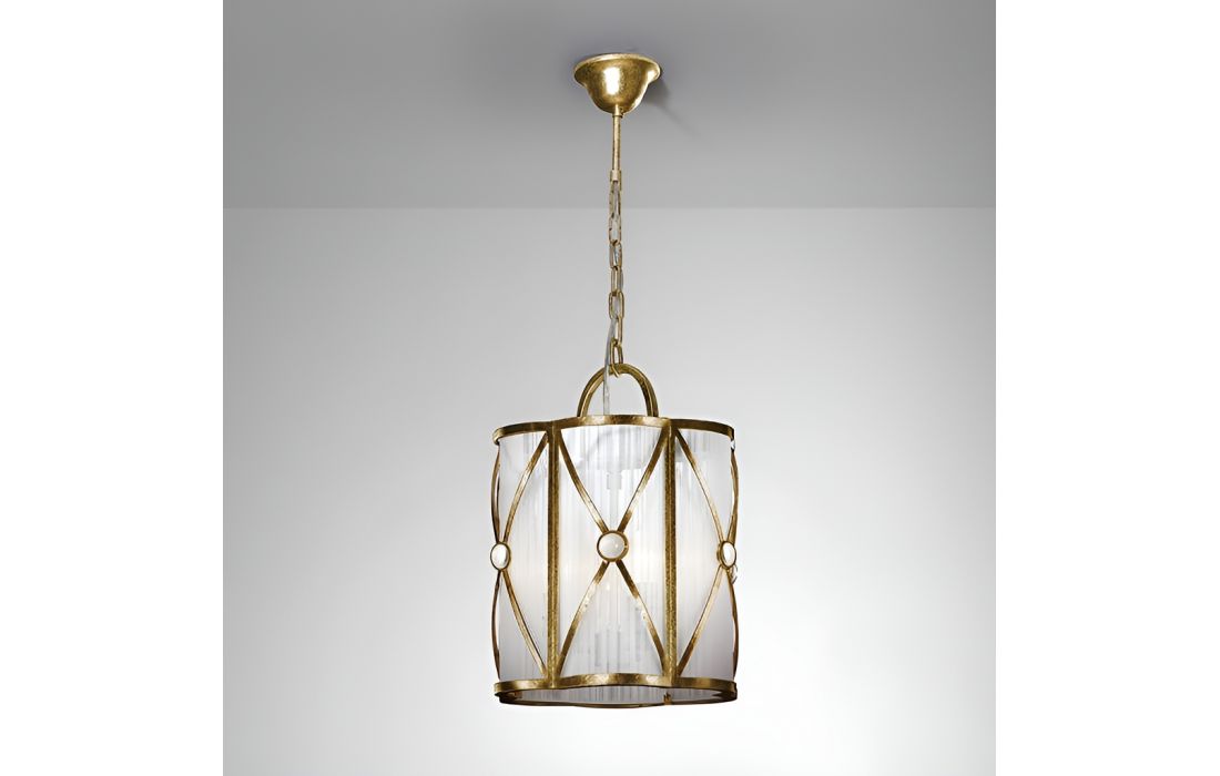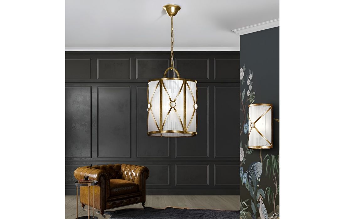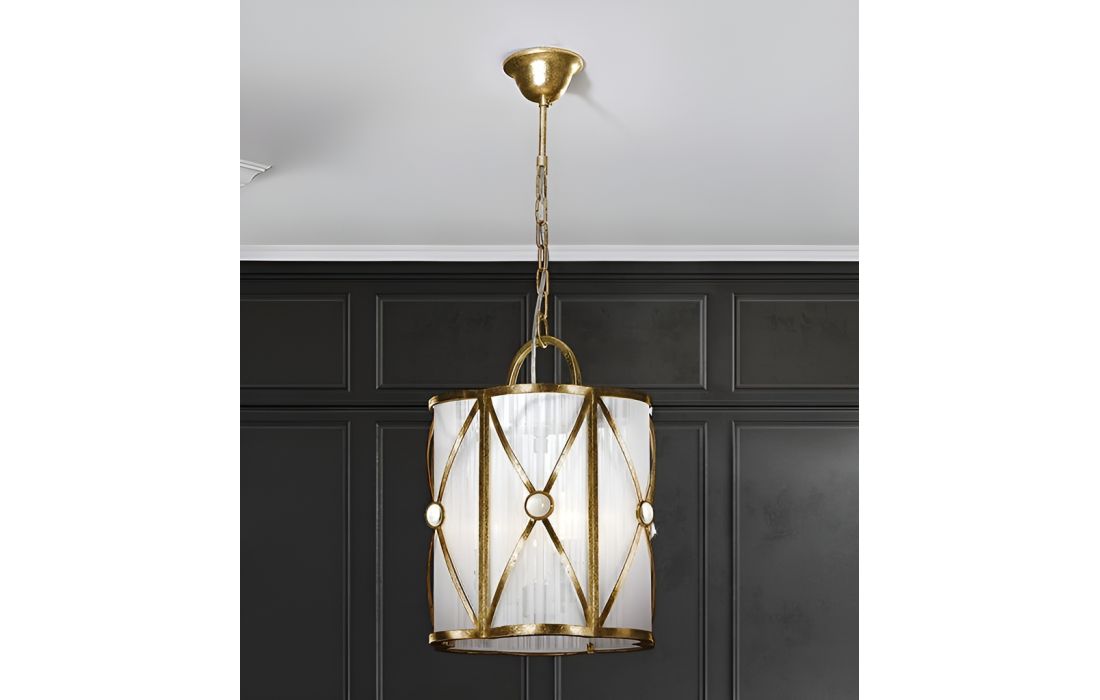 Candeeiro de teto de 3 luzes realizado em metal com acabamento em dourado envelhecido. Tela de fio branco esticado e decoração de vidro transparente nas cruzetas.