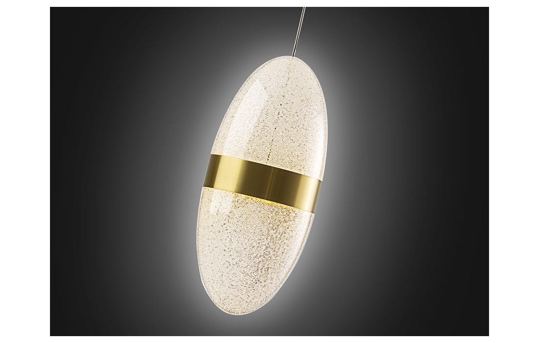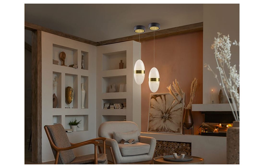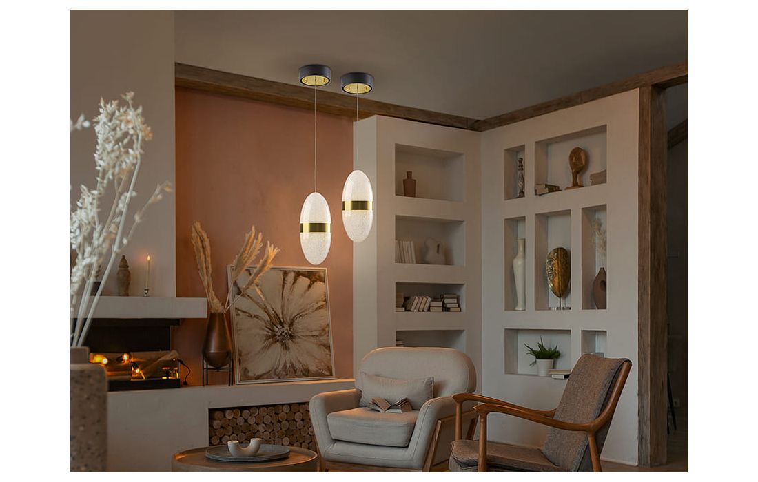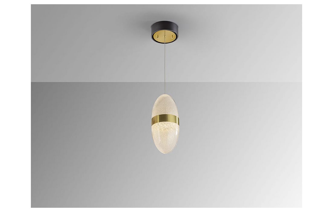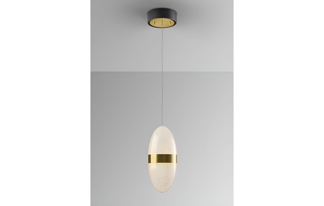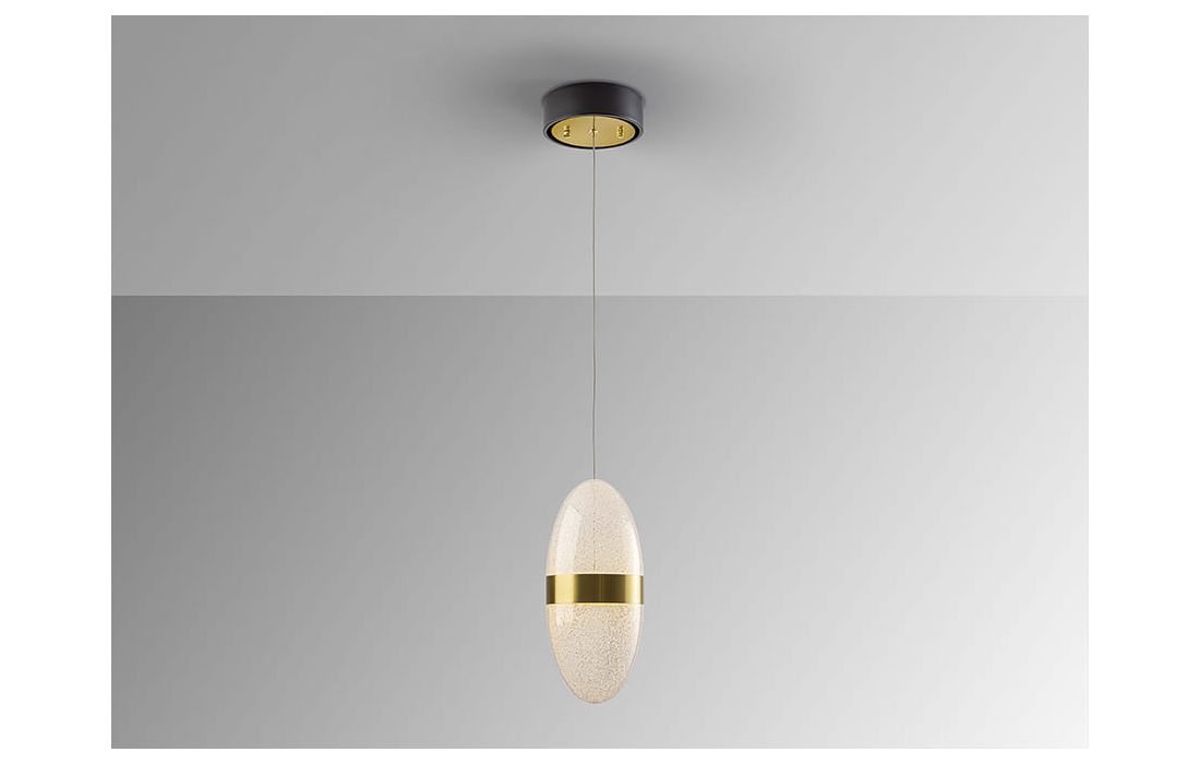 Candeeiro de teto de 1 luz LED, realizado em metal com acabamento preto. Tulipa esferoidal de 15 cm de policarbonato com interior texturizado e aro de metal em bronze. Altura regulável.