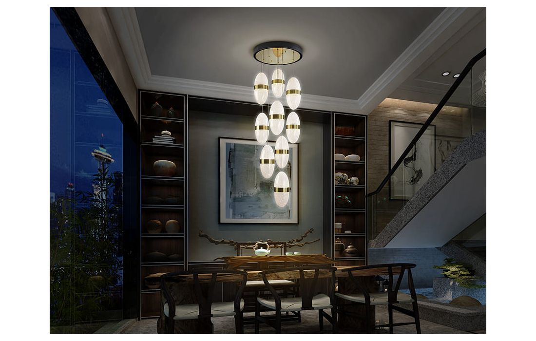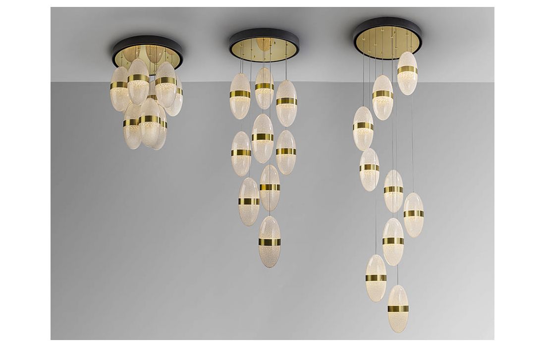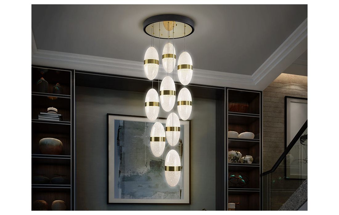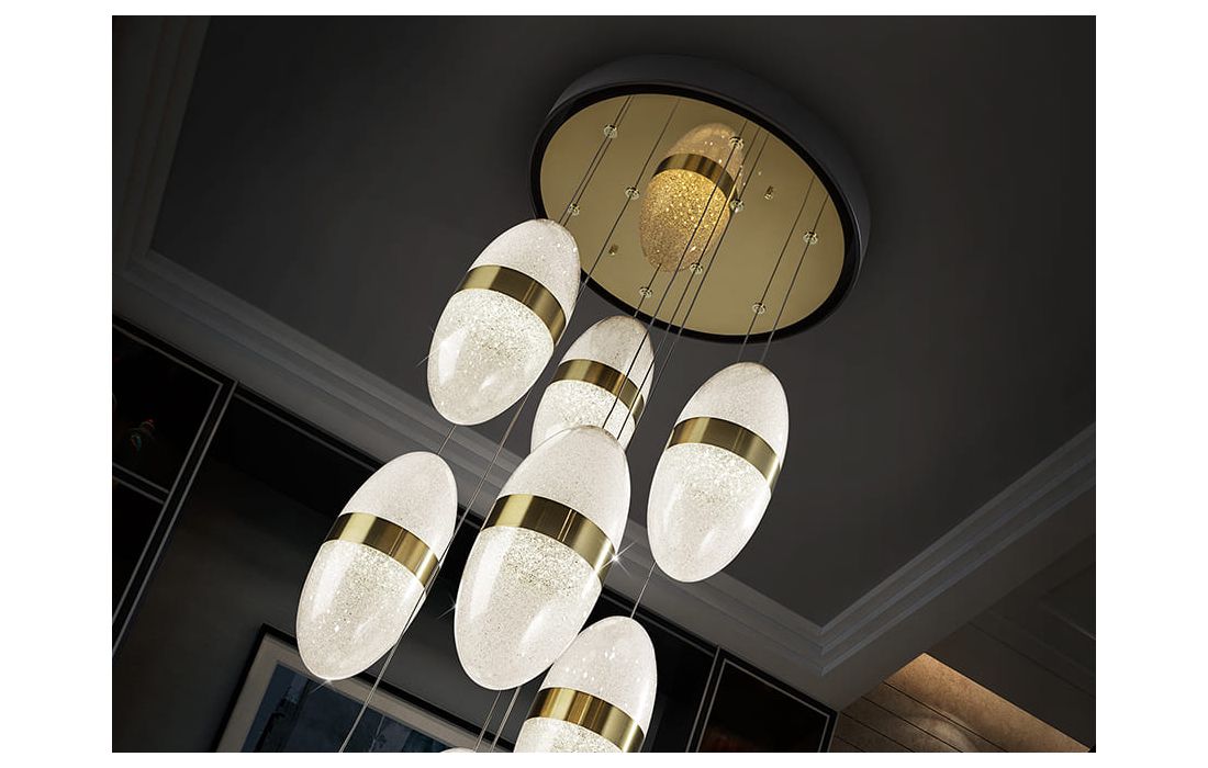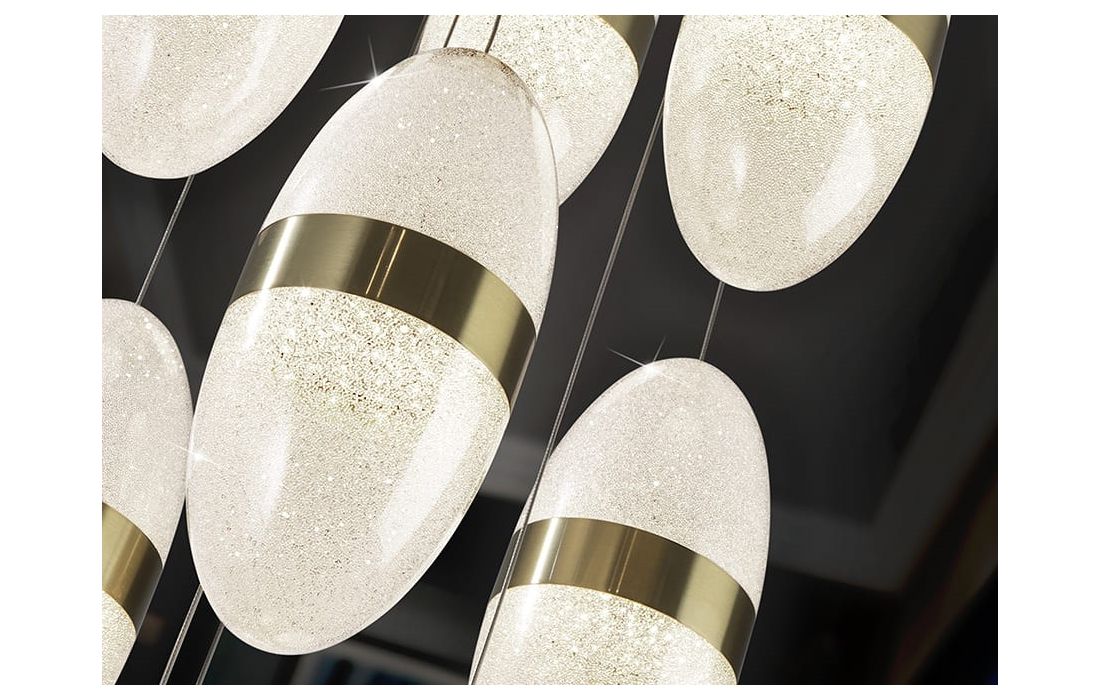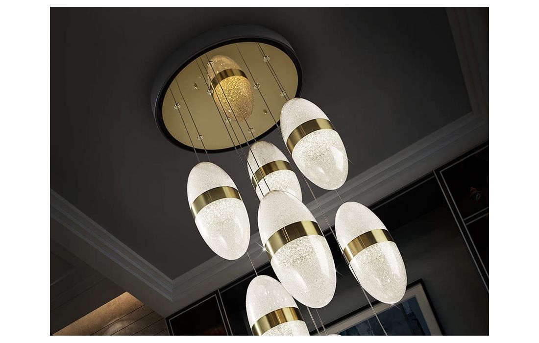 Candeeiro de teto de 9 luzes LED realizado em metal com acabamento preto e dourado. Tulipa esferoidal de 15 cm em policarbonato com interior texturizado e aro de metal latão. Altura regulável.