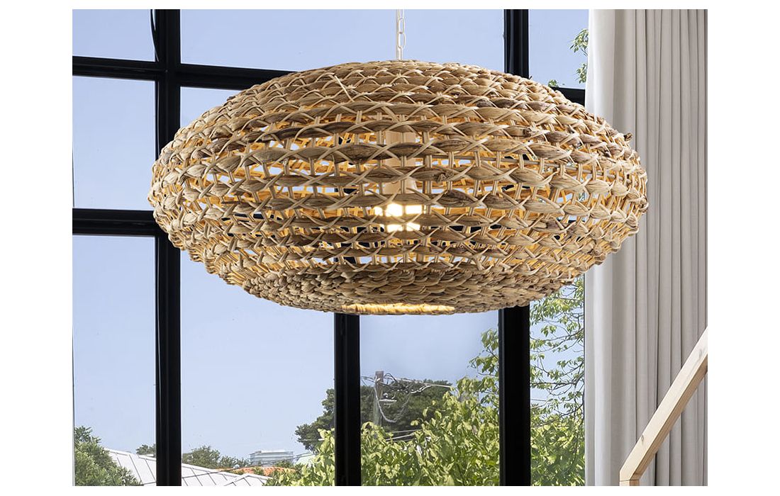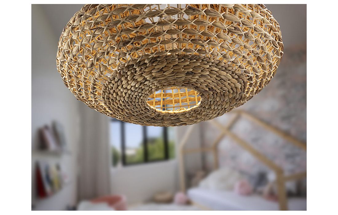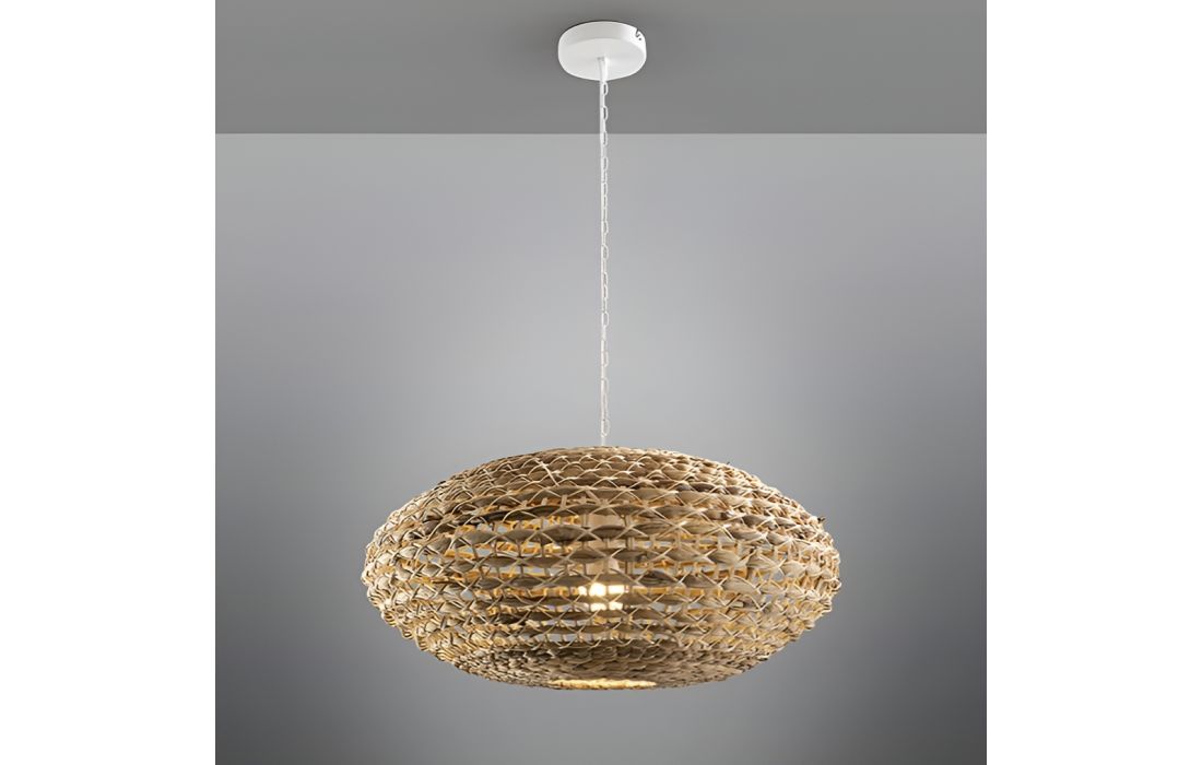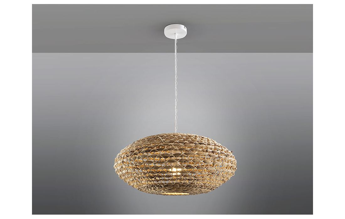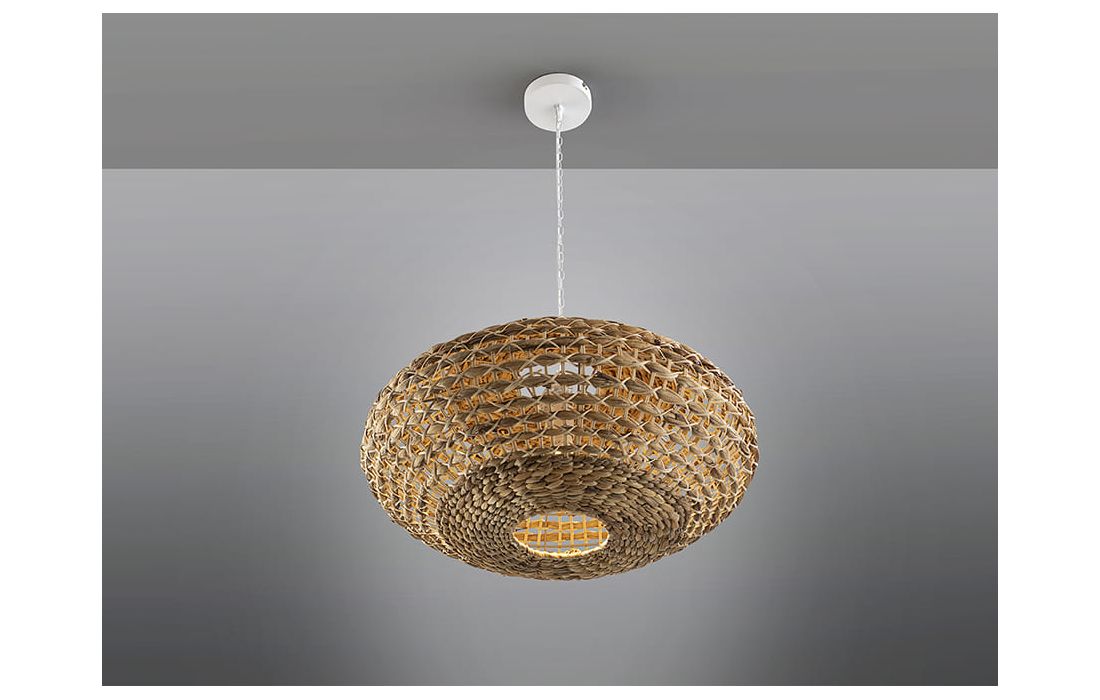 Candeeiro de teto de 1 luz realizado em metal com acabamento branco. Abajur em fibra de rattan e jacinto de água entrançado, com acabamento natural.