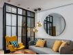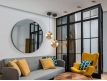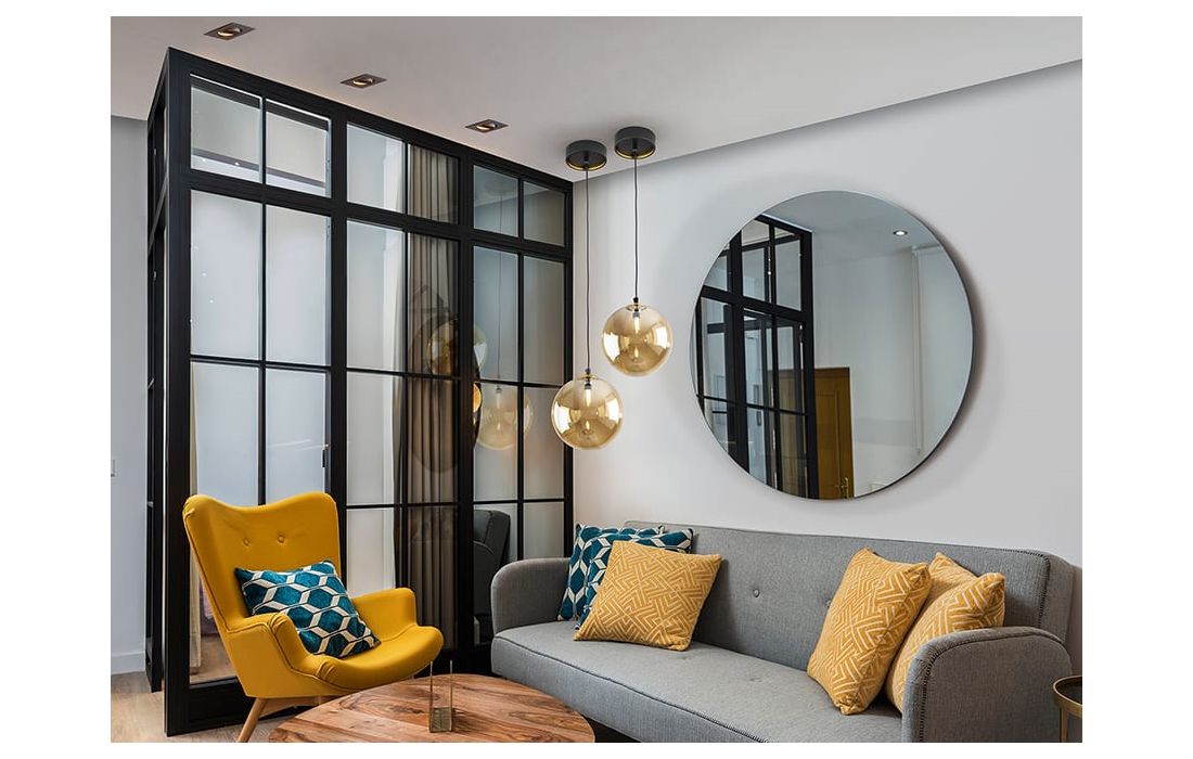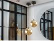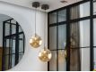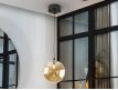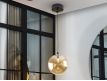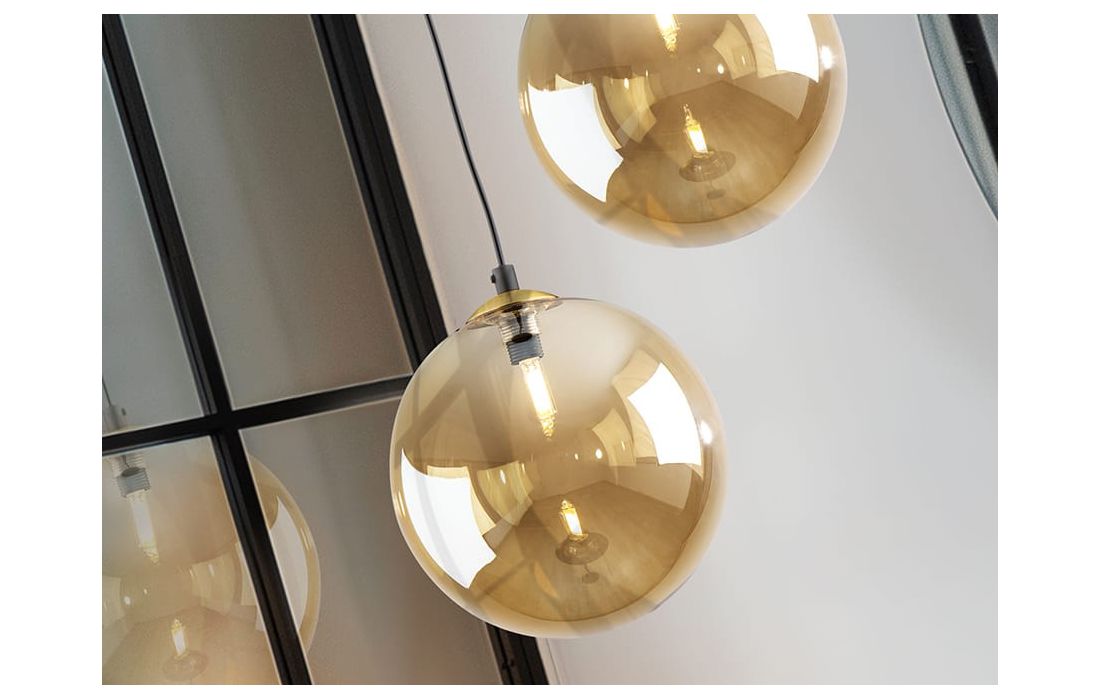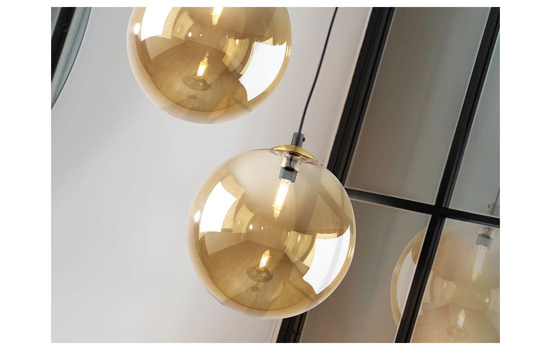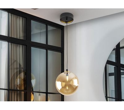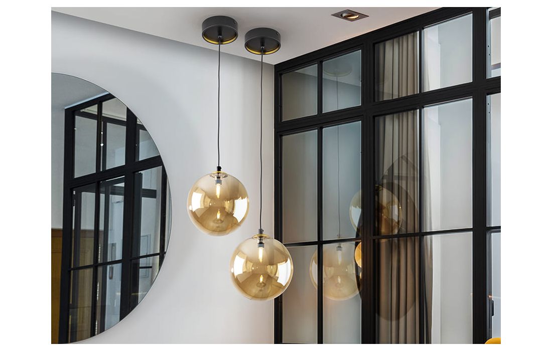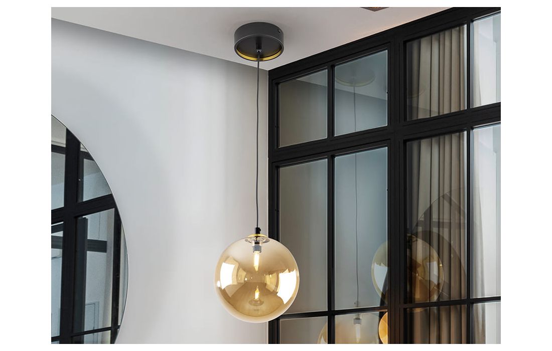 Candeeiro de 1 luz em metal com acabamento preto mate, detalhes de latão acetinado. Abajur de vidro esférico âmbar de 20 cm.