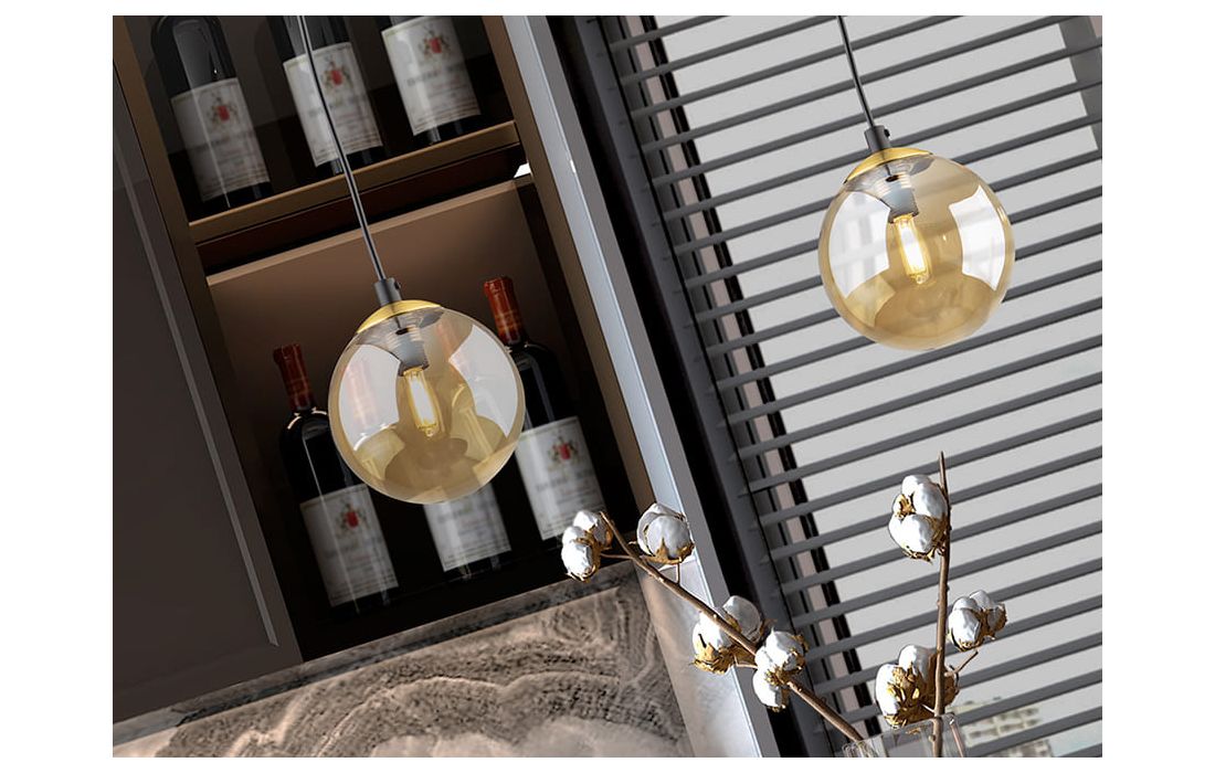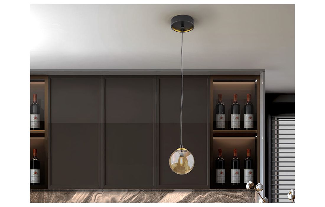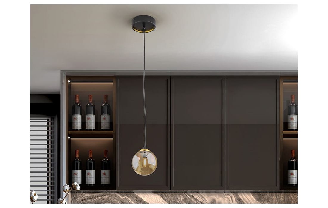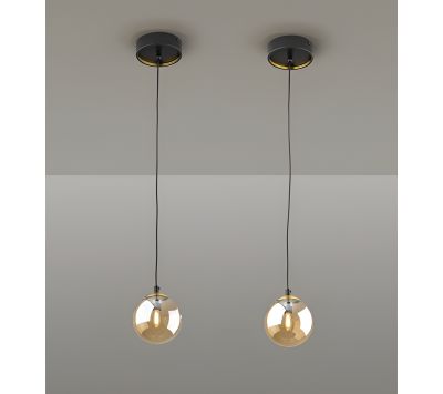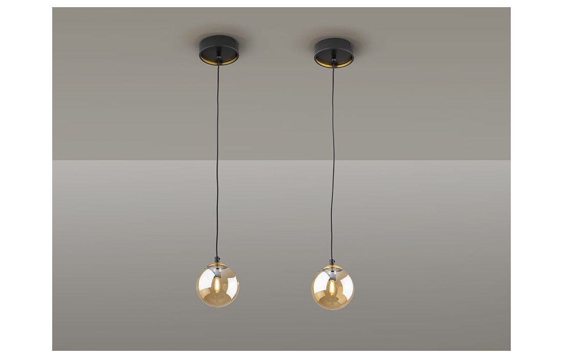 Candeeiro de 1 luz em metal com acabamento preto mate, com detalhe de latão acetinado. Abajur de vidro esférico âmbar de 12 cm.