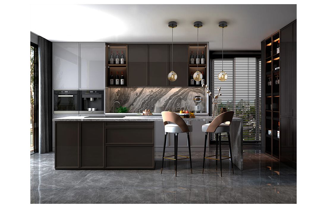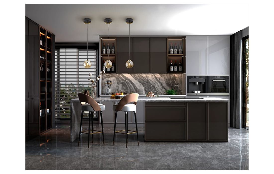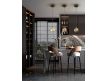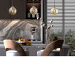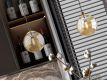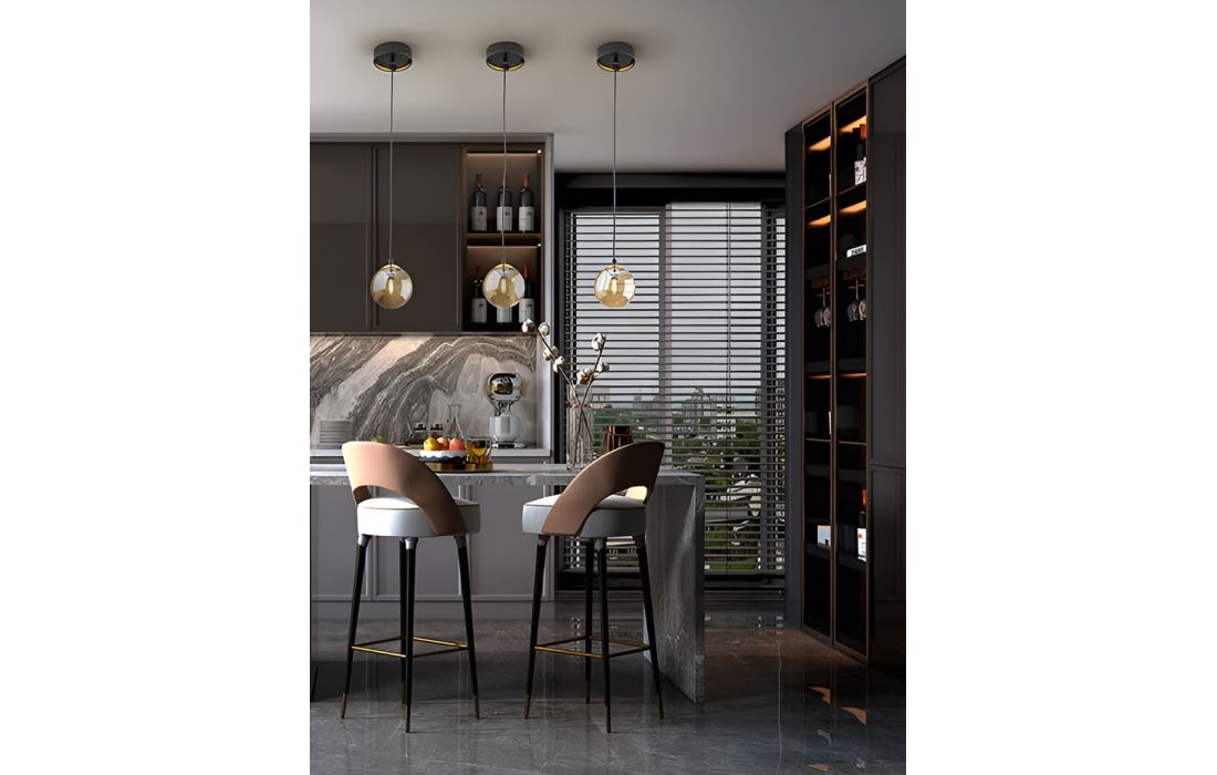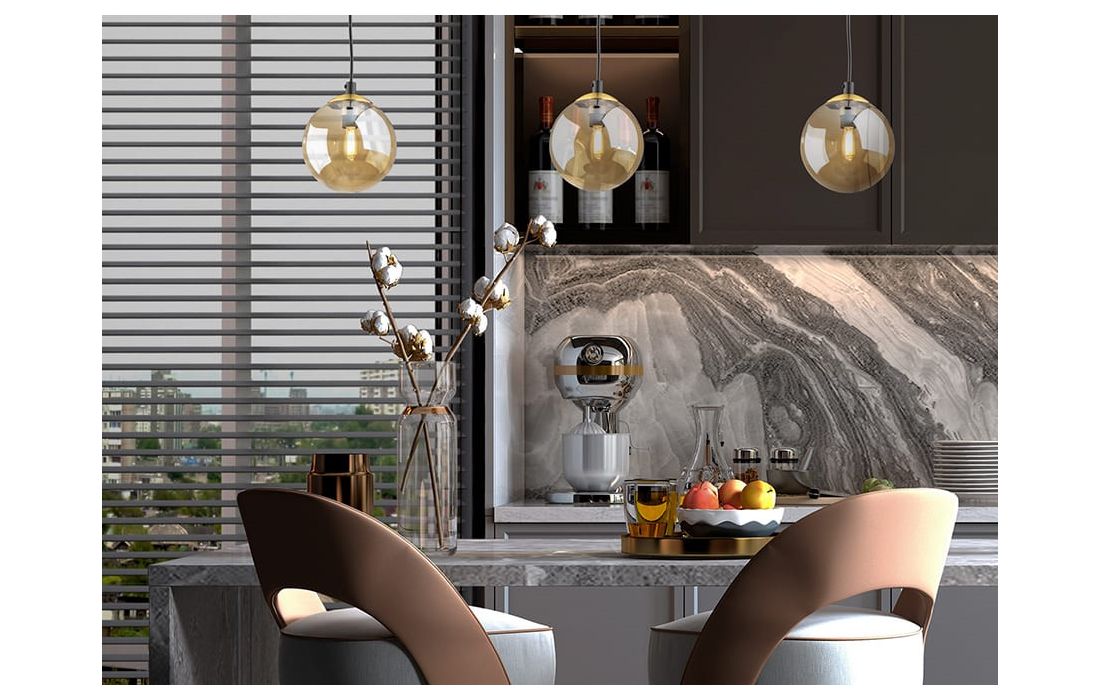 Candeeiro de 1 luz em metal com acabamento preto mate, com detalhe de latão acetinado. Abajur de vidro esférico âmbar de 12 cm.
