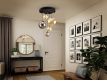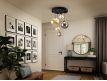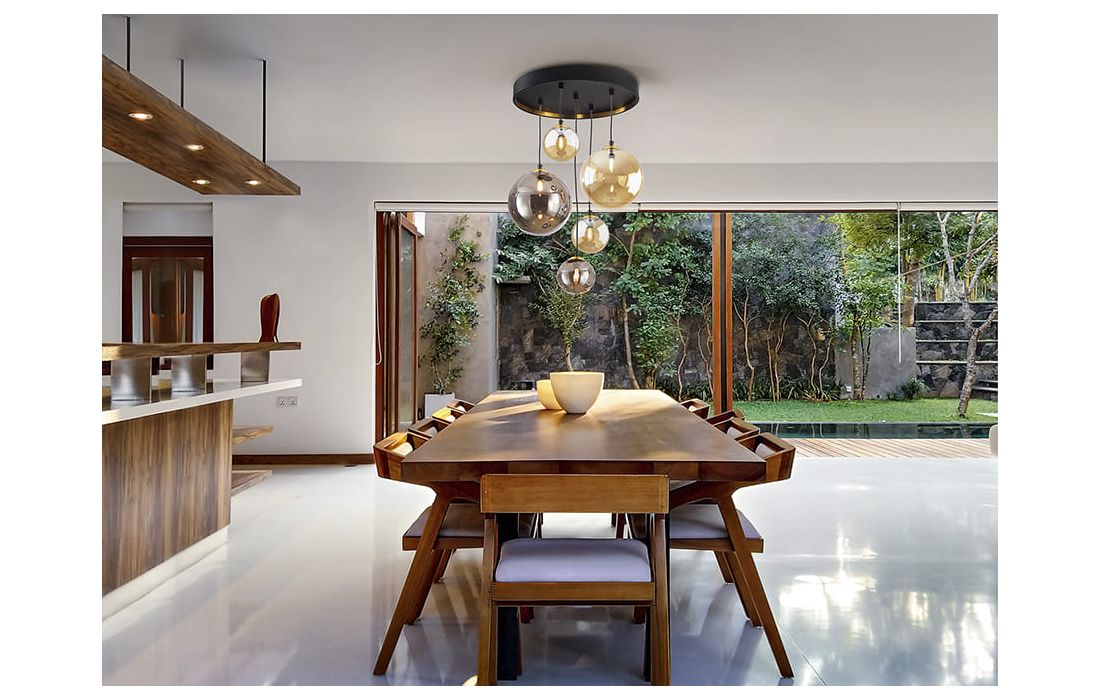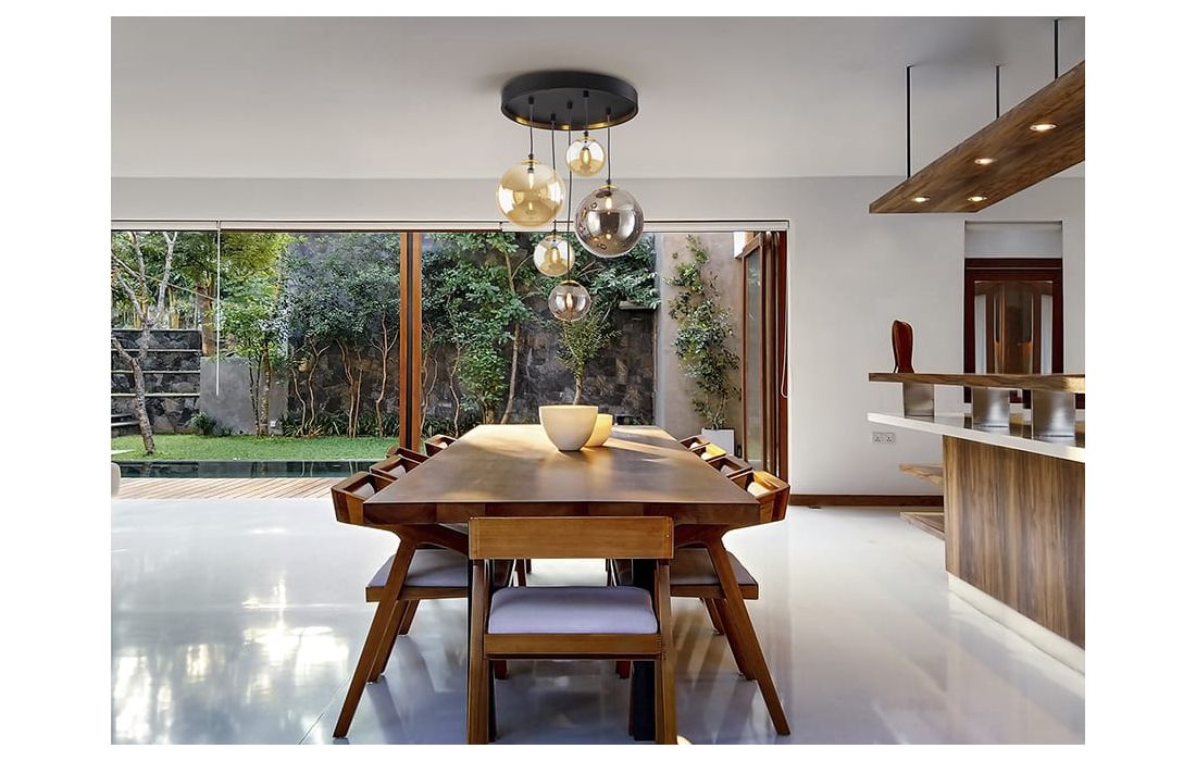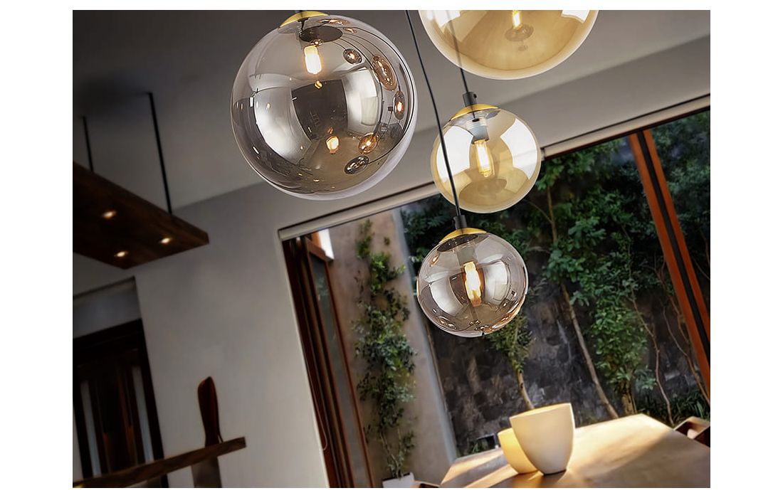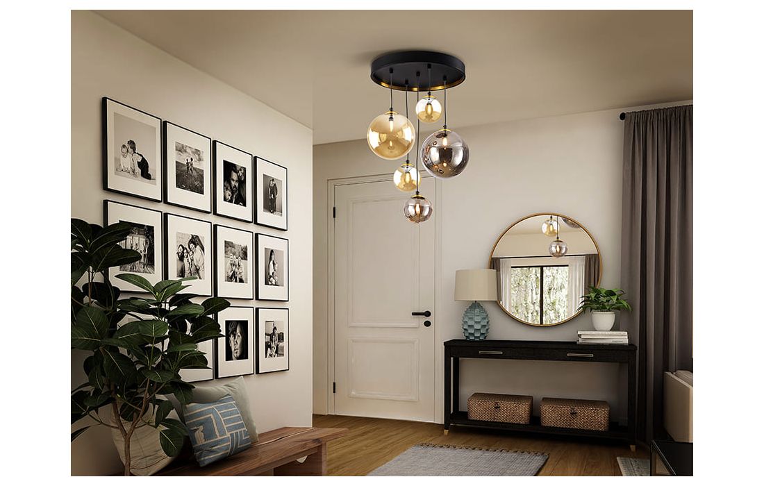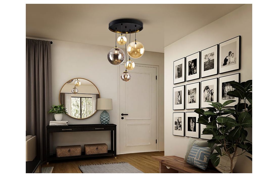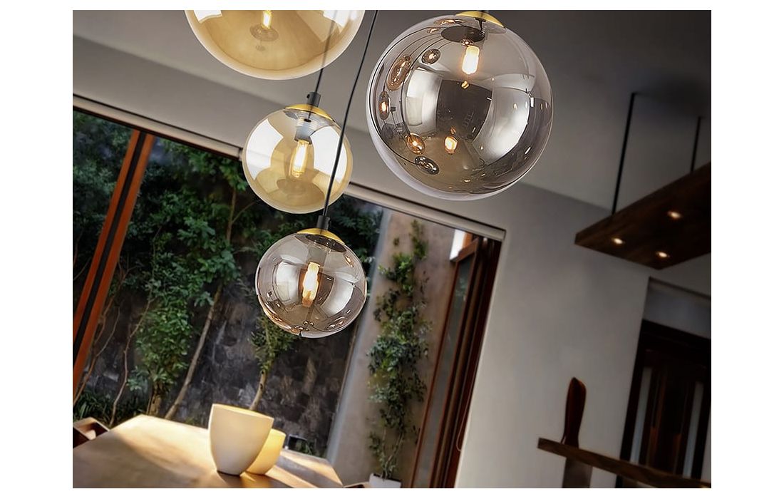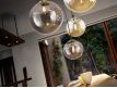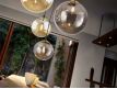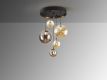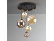 Candeeiro de 5 luzes em metal com acabamento preto mate, detalhes de latão acetinado. Abajures de vidro esféricos de 12 e 20 cm, com acabamentos âmbar e cinzento smoke espelhado. Regulável em altura.