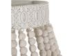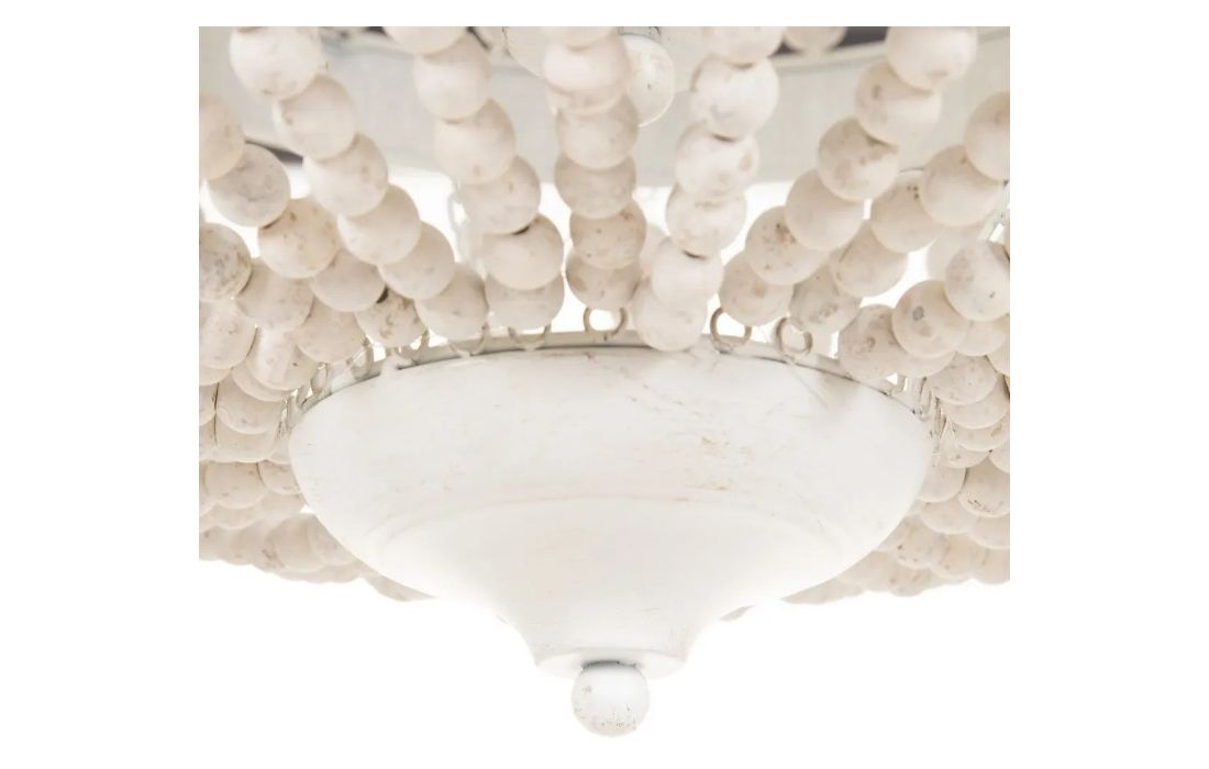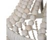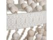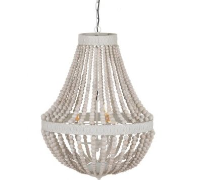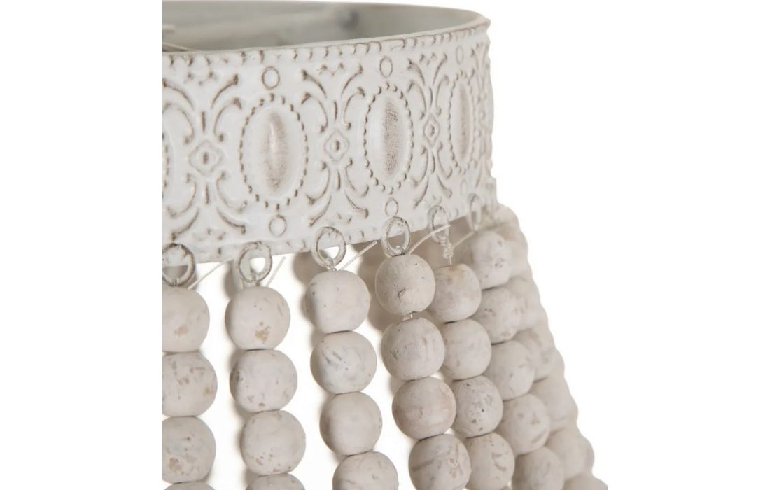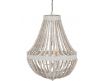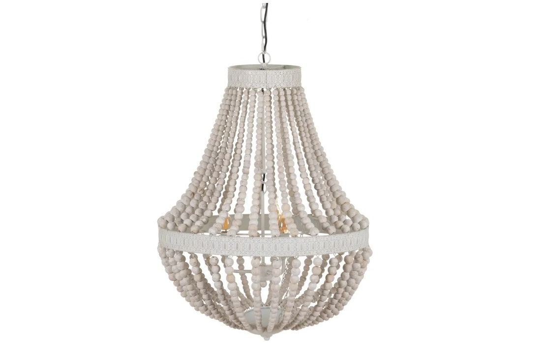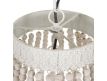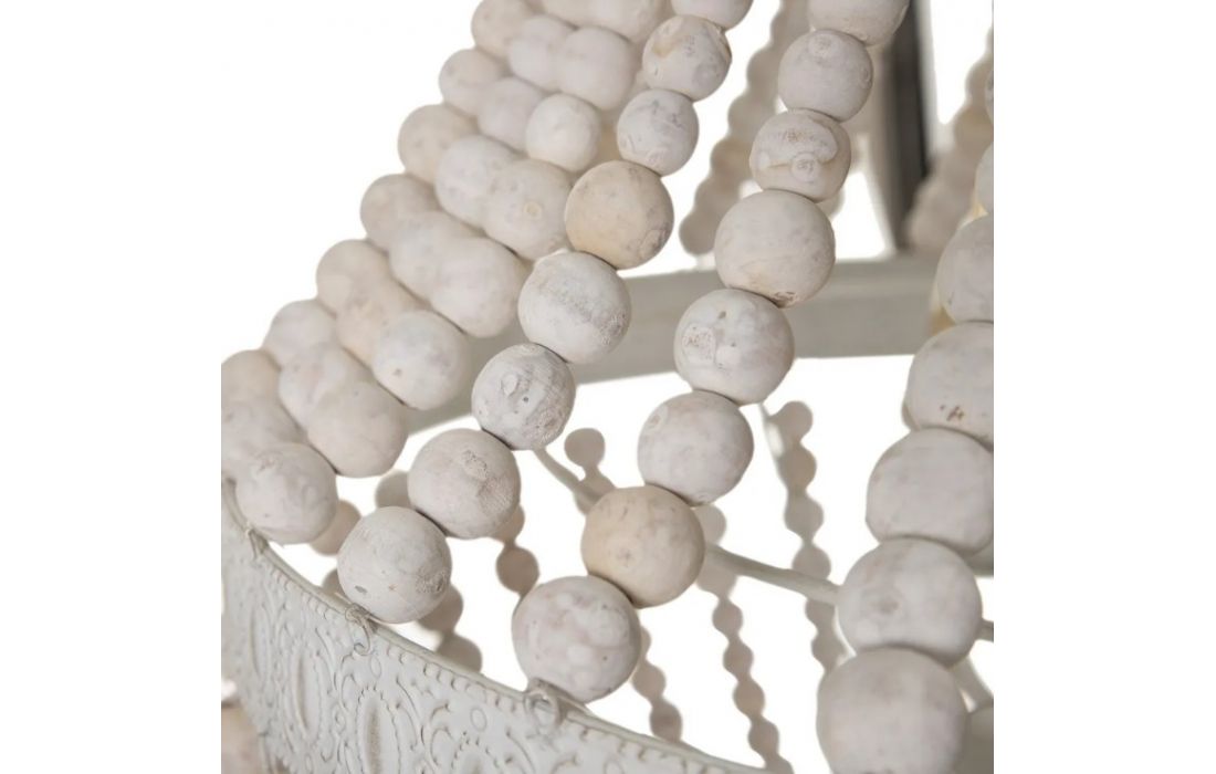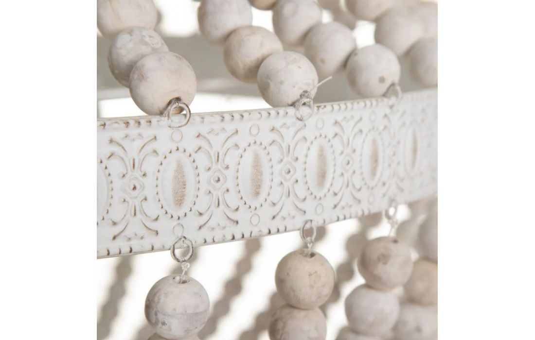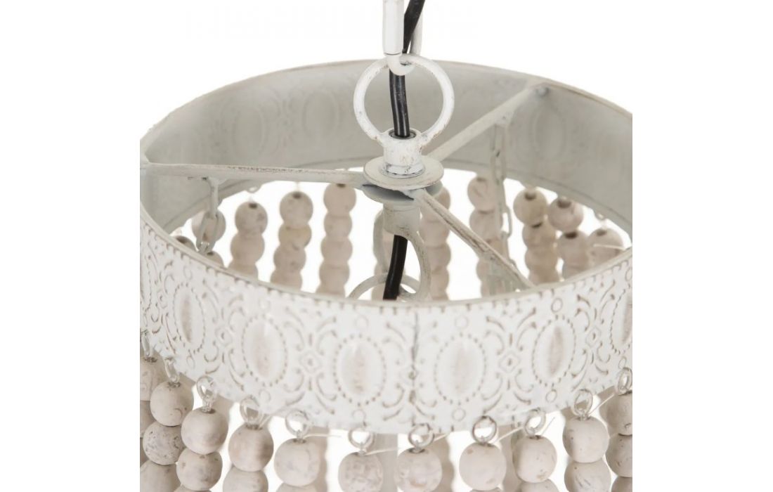 Candeeiro de teto com estrutura em metal e contas em madeira.