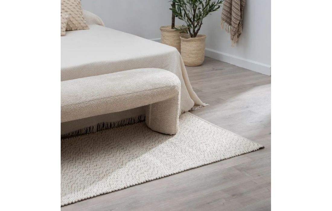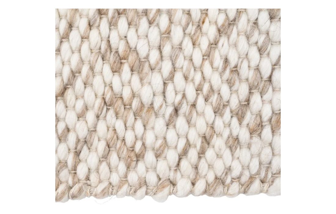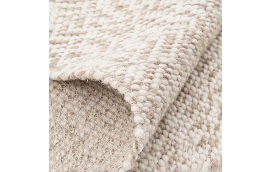 Tapete feito de algodão e lã de cor creme.