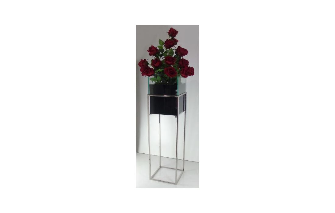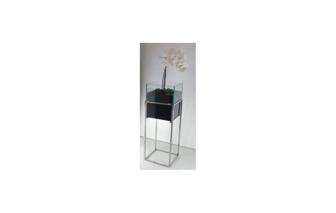 Floreira com estrutura em inox cromado e vidro, vaso em madeira lacado preto brilho.Destinatário :